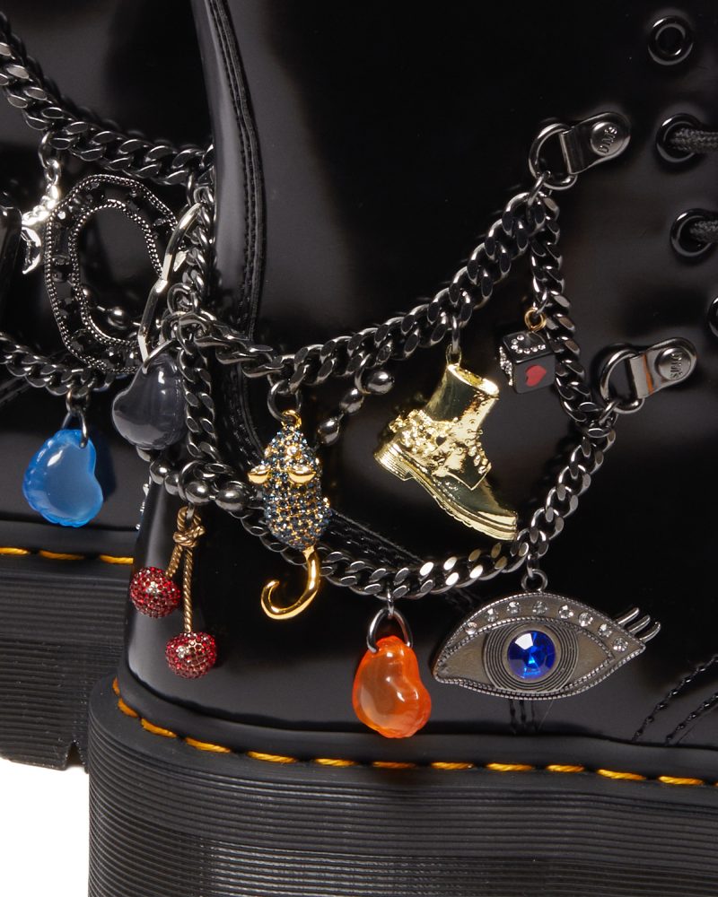 Para celebrar los primeros 10 años de la silueta Jadon, la colabo de Dr. Martens X Marc Jacobs mantiene el diseño original de estas botas de plataforma. Se deja muy poco elemento alterado como señal de respeto hacia su diseño atemporal. Que no se cambie la silueta no significa que no se puedan hacer maravillas, ojo. Lo que más salta a la vista de este par colaborativo son los apliques de cadenas que decoran el talón. Sujetadas con remaches, las cadenas dejan ver adornos y “recuerdos” que simbolizan códigos atesorados por Jacobs.