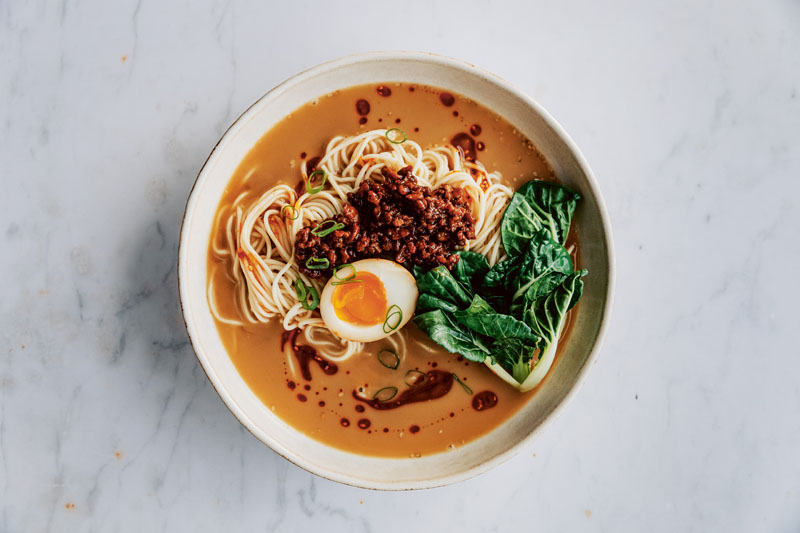 Aunque muchas de las recetas son complejas, sobre todo si quieres hacer tu mismo los caldos y la pasta, la autora también da la opción de saltarte ciertos pasos comprando algunas elaboraciones ya preparadas. También nos explica como guardar determinados productos en el congelador para echar mano de ellos en cualquier momento en el que queramos hacer alguna de sus recetas. Nos explica como crear las bases que luego serán muy útiles para muchos de sus platos ¿Algunas de estas bases? Chile asado en polvo, Pasta Málà, Caldo de cebollas asadas, Caldo maestro o los Huevos Ramen. Estos huevos se han convertido en algo común en los restaurantes fusión españoles. La receta consiste en una cocción corta (no se llegan a poner duros) y luego dejarlos macerar en la nevera (entre 1 y 5 días) en una salsa hecha con soja, mirim y caldo dashi.