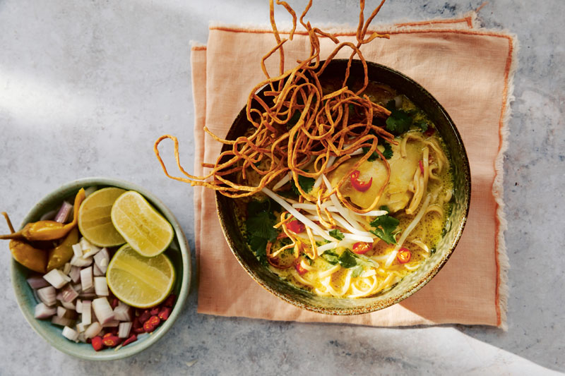 Imagen superior: Noodles y pollo al curri de coco