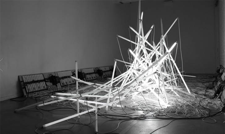 Comenzamos el recorrido en el día de apertura: el jueves, a partir de las 19 h se puede visitar la exposición de arte digital y todas sus instalaciones. Situada en el Hall Horta, una de las principales atracciones de la exhibición es la pieza White circle. Esta obra, que estará en display del 22 al 25 de septiembre fue creada por el sello discográfico alemán Raster-Noton para la celebración de su 20 aniversario. White circle es un espacio acústico-arquitectónico diseñado como una instalación audiovisual que convierte el sonido en una experiencia espacial escultórica. La pieza ha sido desarrollada por los artistas del sello Alva Noto, Byetone, Frank Bretschneider y Kangding Ray.