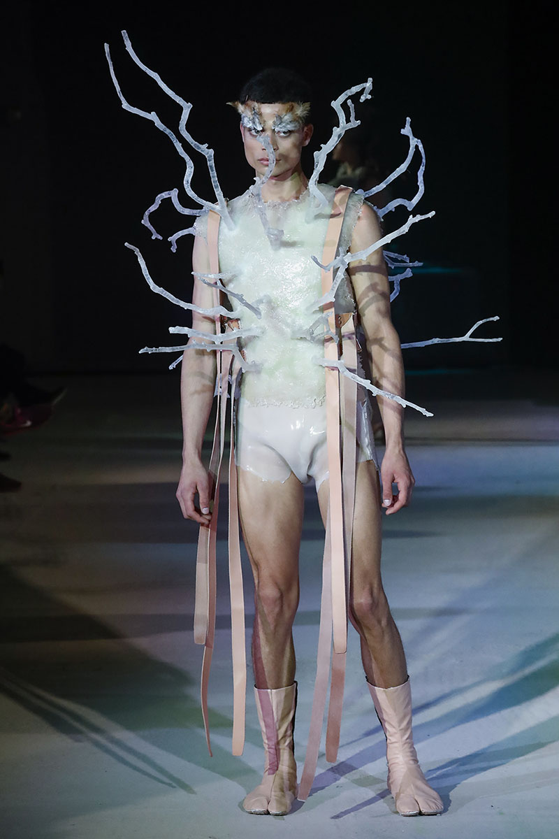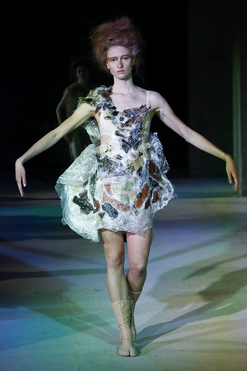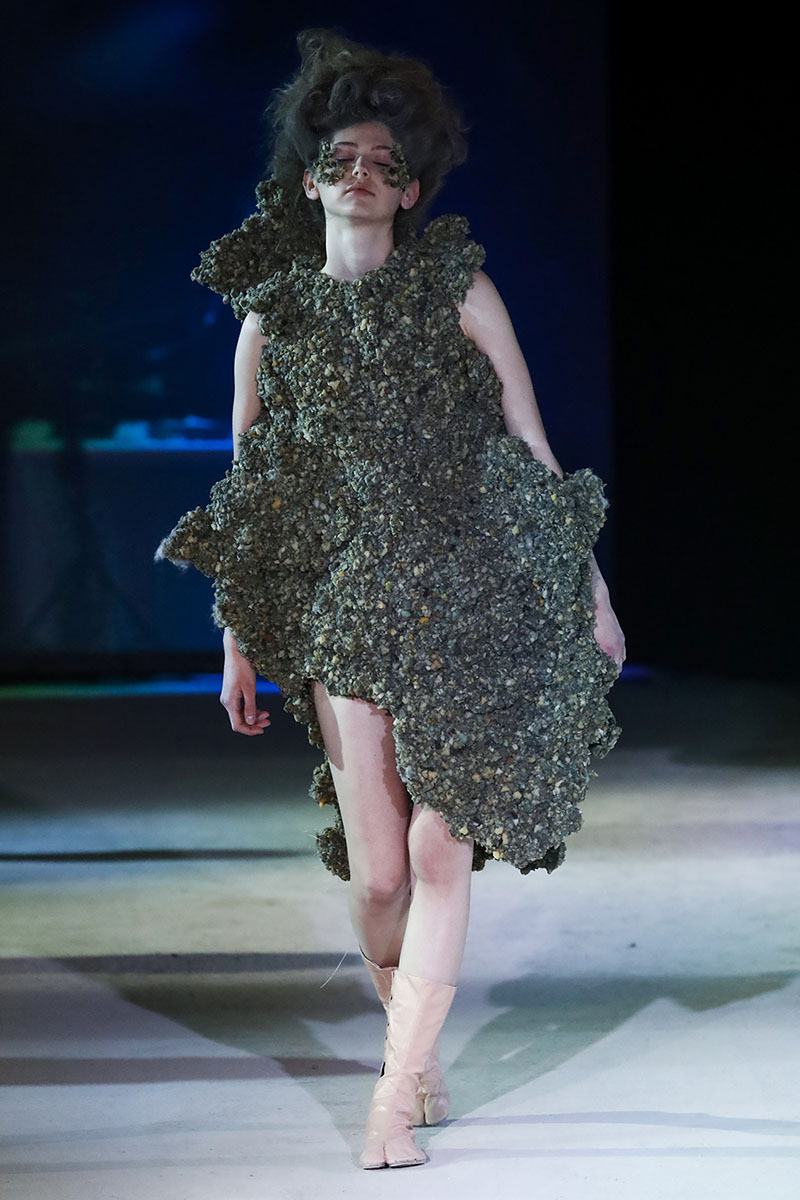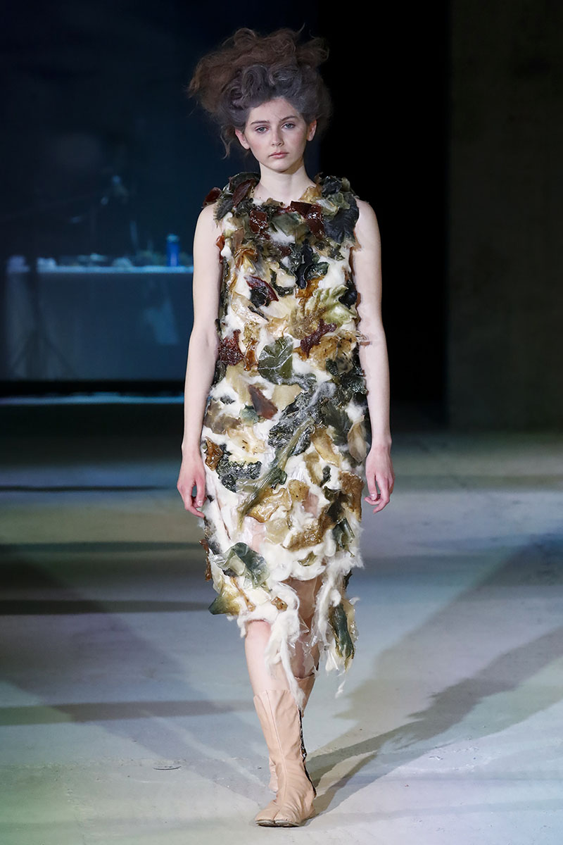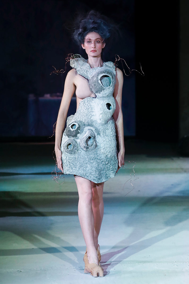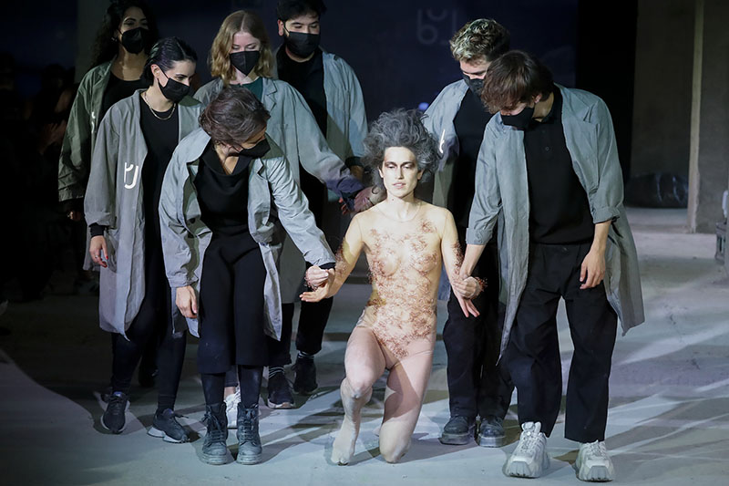 ¿Cuál ha sido el material más raro y/o difícil de manejar que finalmente sí que ha resultado apto para confeccionar? Todos los materiales con los que trabajamos suponen un reto ya que muchos de ellos no se trabajan en moda o en el cuerpo pero justo eso es lo interesante, ya que te colocan en un punto en el que tienes que pensar nuevas técnicas manuales o digitales para adaptarlos al cuerpo. En concreto, la pieza “Oruga de tienda” hecha mediante moldes de ramas caídas, replicadas con resina transparente fue un reto importante. Es una pieza muy escultural, requirió muchos pasos y mucha técnica para llevarla a cabo, también fue una pieza con la que se aprendió muchísimo.
