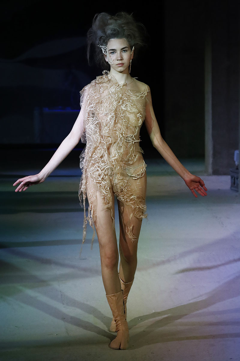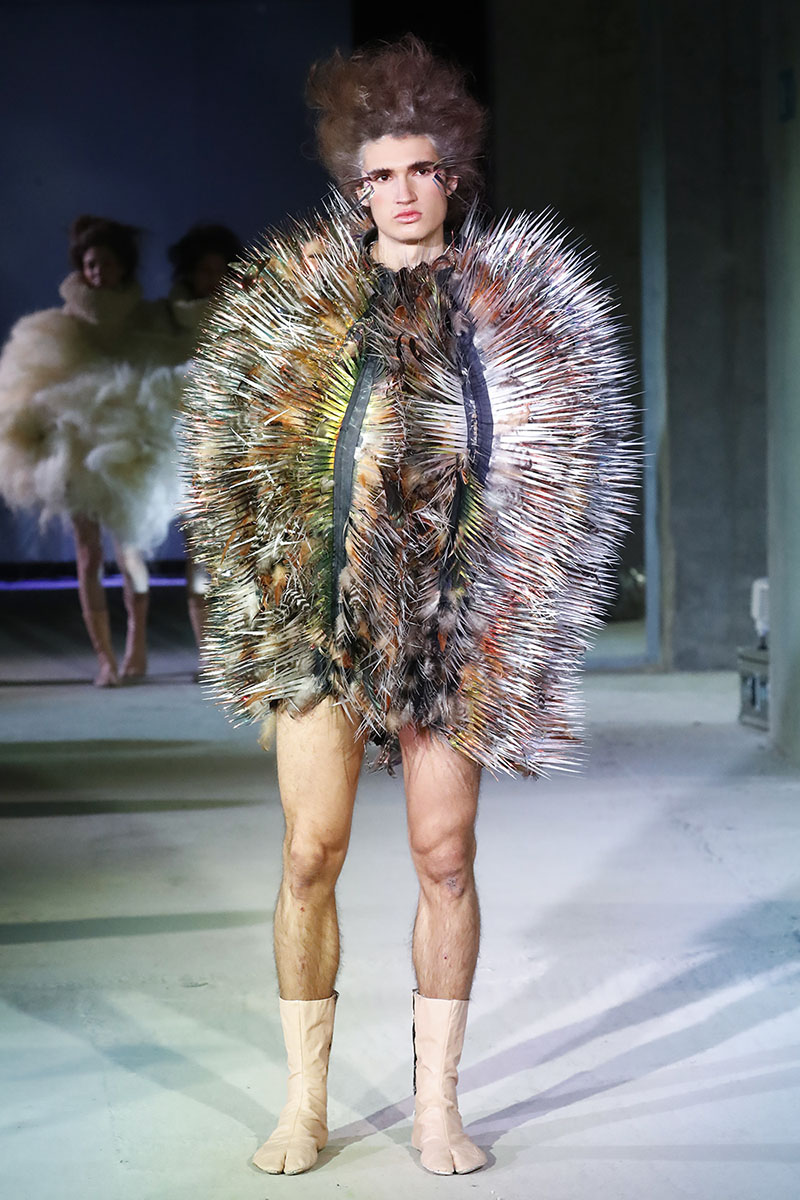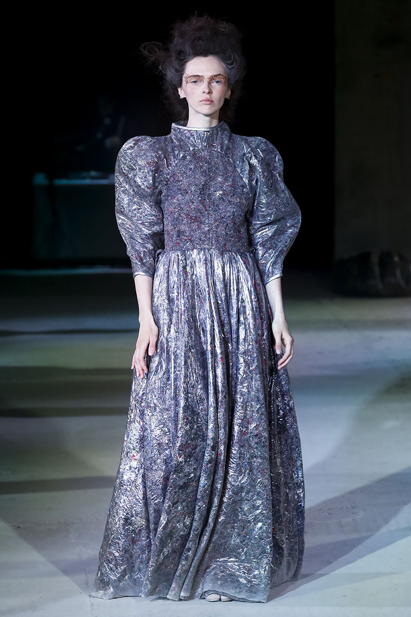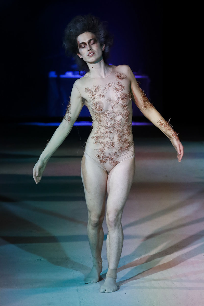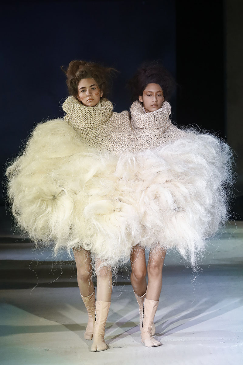 Uno de los looks que más sorprendió y fascinó al publico (me incluyo) fue el look siamés en forma de nido del final del desfile, pero no es la primera vez que vemos algo de ese estilo con tu firma ¿Tiene algún significado especial? Varias personas nos han comentado lo mismo. Es cierto que las siamesas es una figura que se repite, me parece muy interesante y me intriga de muchas maneras. Por un lado, me interesa muchísimo explorar la idea de la moda más allá de un único cuerpo. Las siamesas nos permiten entender los trajes compartidos más como una envolvente que como un vestido. Estas piezas abren las posibilidades a explorar nuevas relaciones entre distintos cuerpos o incluso entre cuerpos y espacios. Por otro lado, me interesa a nivel emocional la idea de un cuerpo unido a otro. Las siamesas funcionan como una metáfora visual en este sentido. De alguna manera creo que todos estamos unidos a distintos niveles con la gente que queremos aunque estas uniones no sean visibles.