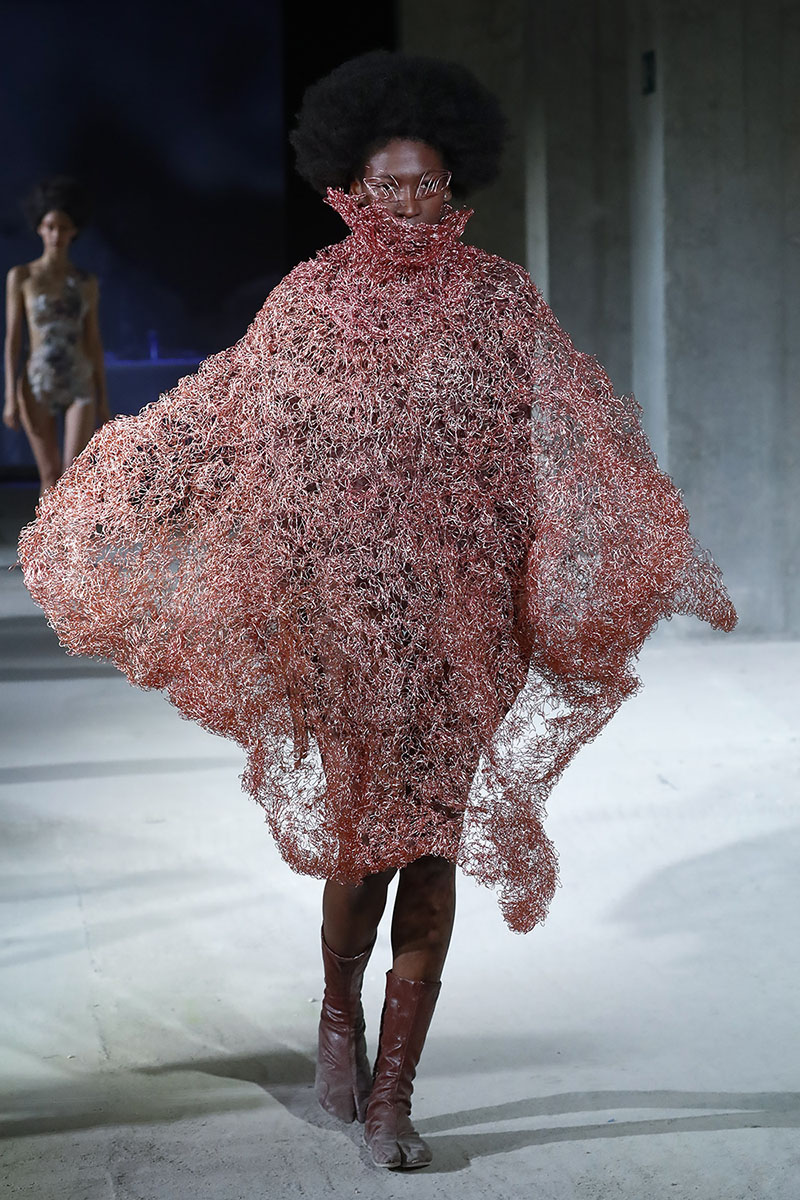 ¿Cuál es el símil más evidente entre moda y arquitectura dentro de la nueva colección “Nidos”? ¿De qué forma has conseguido dar ese enfoque contemporáneo y de actualidad que pudimos disfrutar en la presentación? Mirando a la Naturaleza y más allá de nosotros mismos, descubrimos otras especies que construyen increíbles arquitecturas primitivas: los nidos. Las aves y algunos insectos, todos ellos arquitectos primitivos, utilizan su cuerpo para recogen materiales de su entorno que manipulan empleando técnicas muy sofisticadas para construir sus espectaculares cobijos. Estos animales rescatan los sobrantes que sus propios ecosistemas les proporcionan, empleando desde ramas, plumas, barro u hojas, pero también, debido al impacto del ser humano, materiales como plásticos o aluminio entre otros.