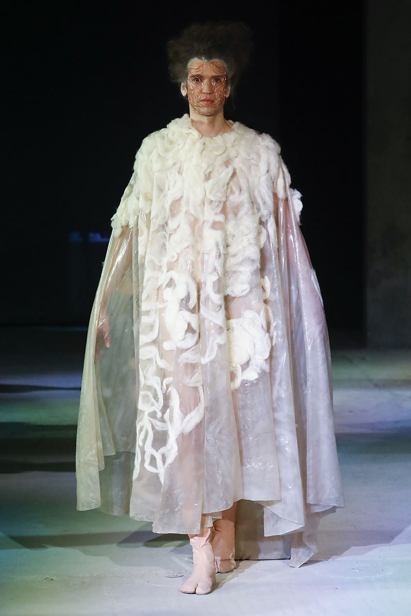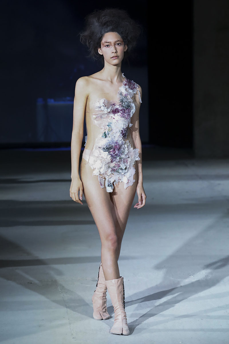 Todo estaba medido y calculado al milímetro en la apasionante presentación de la colección. El lugar, la performance, el maquillaje, la BSO, las luces, los visuales… todo tenía sentido y encajaba a la perfección con los “looks” que los modelos mostraban al publico en aquel espacio inacabado (White Lab), consiguiendo crear una idílica atmósfera que plasmaba a la perfección el complejo concepto materializado gracias al ingenio de la creadora y por supuesto al gran equipo que está detrás de las creaciones de BUJ Studio.