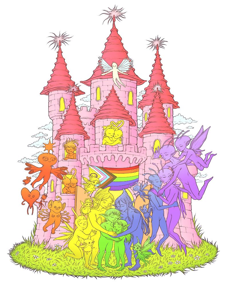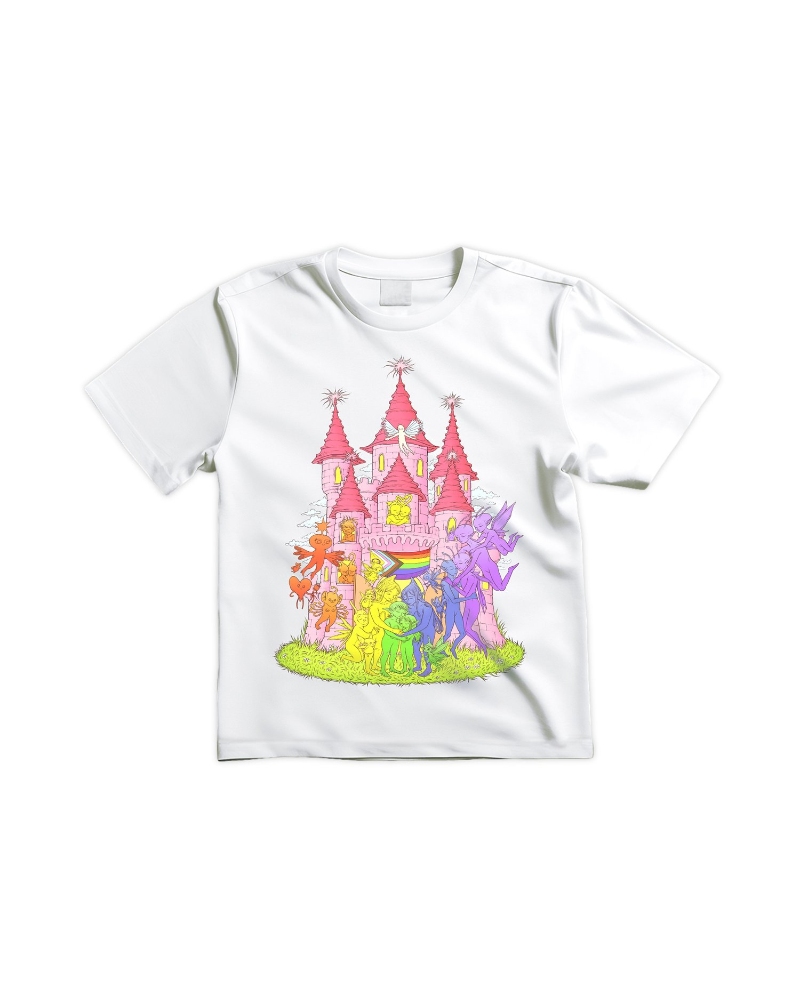 ¿Y cómo es la camiseta solidaria para el Pride 2025 de Charlie Smits? Sinceramente, es un diseño que mantiene la esencia de todo lo que solemos ver en su obra. Sobre una camiseta blanca, ha dibujado un castillo repleto de seres mágicos. Un lugar donde todos son bien recibidos, no hay discriminación y la bandera que ondea en lo alto es la del colectivo LGBTQIA+. Este diseño es un fiel reflejo de lo que representa la Fundación Eddy-G. Un centro de acogida donde no existen los tonos oscuros ni la tristeza, sino que predominan el color y la libertad, devolviendo la esperanza a los jóvenes que viven allí.