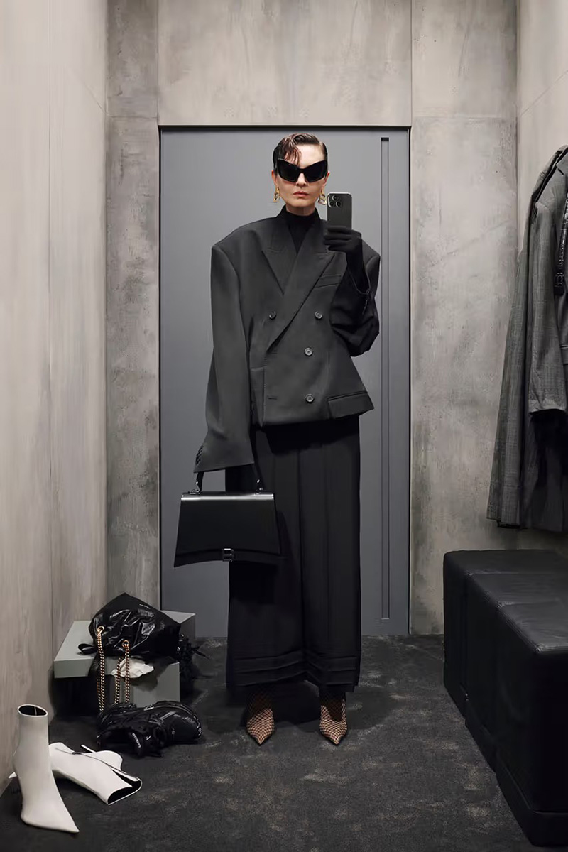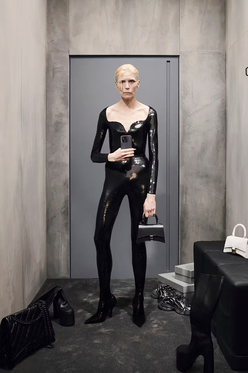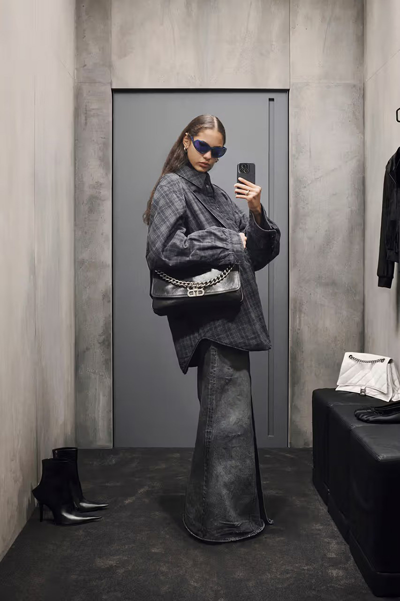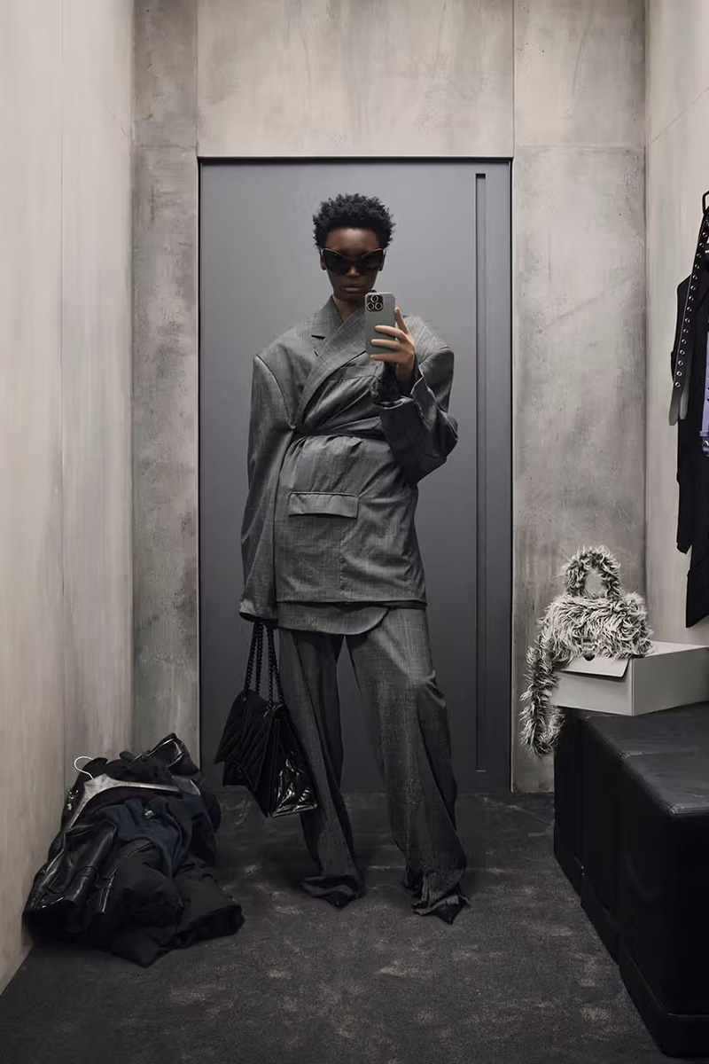 La nueva campaña de Balenciaga para Fall 23 se pone bastante costumbrisa, mostrando a los modelos como clientes que se están probando las prendas y haciéndose fotos; así como las que hacemos unos cuando necesitamos aprobación de nuestros amigos antes de pillarnos algo. Estos 30 looks que vemos son salidos de la colección que vimos recientemente desfilar en (tal vez) el evento más understated de la firma bajo la dirección de Demna y pensando ya en el otoño. Para tranquilidad de muchos, esta nueva campaña parece devolver ese velo de moda urbana a Balenciaga que creíamos haber perdido al ver la colección FW23-24 en París. Las piezas pulidas están ahí; pero se han canalizado acorde con lo que muchos consideramos como el mayor valor de Demna: su lenguaje subversivo, urbano y distópico.