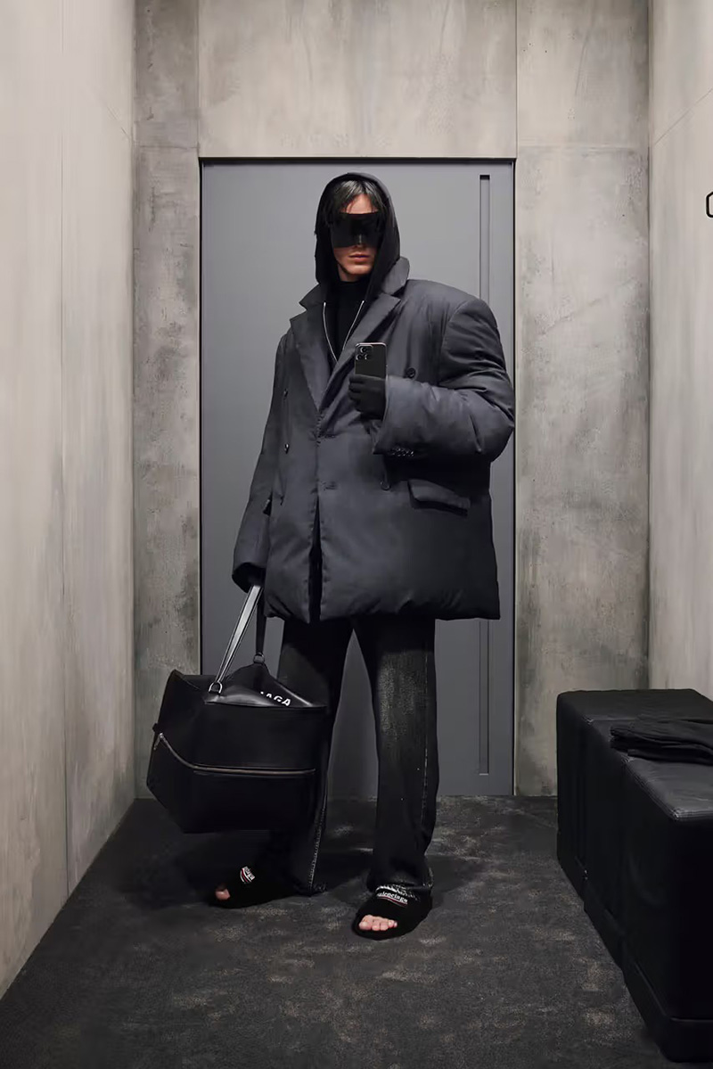 Accesorios como bolsos sobredimensionados y gafas de sol que cubren todo el rostro vuelven a encabezar la propuesta de accesorios de Balenciaga. Para los amantes de las sneakers vemos el debut oficial de la nueva silueta de calzado: las zapatillas 3XL con silueta exageradamente chunky. También, pilares esenciales del clima frío reaparecen en nuevos formatos: botas de goma súper altas y guantes acentúan los mejores looks.