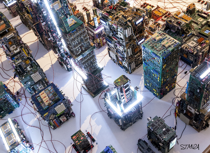 Esta obra de arte está en constante evolución. Es una instalación polisémica que integra conceptos como la propiedad de datos, la vigilancia, el espacio-tiempo real y los entornos urbanos. Nos hemos convertido en cómplices de la máquina de vigilancia mundial que se apropia de los ciudadanos viéndolos como unidades de datos para obtener beneficios. Se pieza es una mini metrópolis realizada con placas de computadoras que supervisa los comportamientos, las actividades y los datos cambiantes del mundo que nos rodea. Y representa la complejidad de la vida urbana en tiempo real a partir de datos transmitidos por una red de dispositivos inalámbricos.