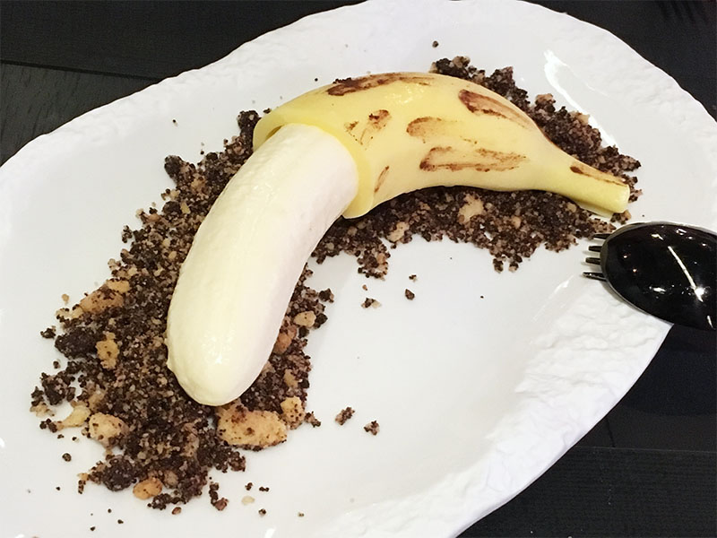 Imagen superior: postre Espectacular plátano helado “Oro parece… plátano es” en Canalla Bistro
