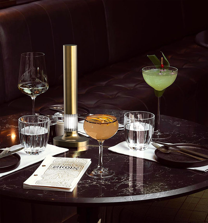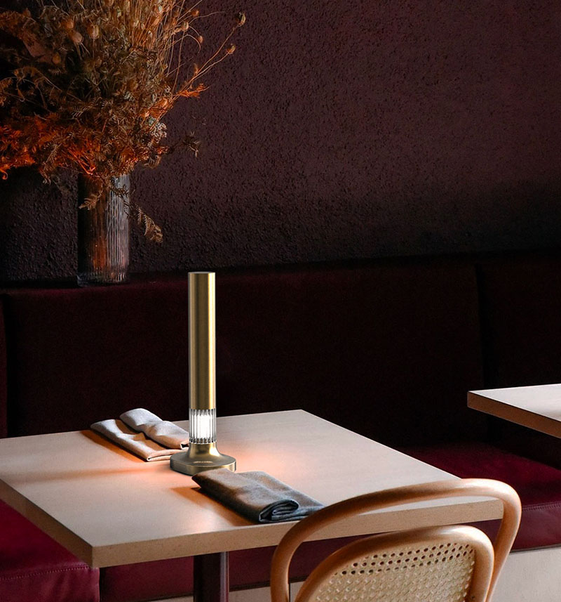 Canneté es una lámpara de mesa inalámbrica con tecnología LED y con baterías recargables. Perfecta para mesas de bistró o salas de té donde crear la atmósfera adecuada a través de la iluminación es un imperativo esencial. Está fabricada con un cilindro de latón y un vidrio de borosilicatado estridado. En su interior 1 LED G4 máximo con fuente incandescente