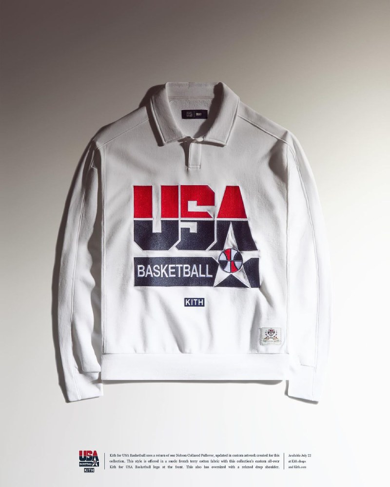 El resto de la cápsula Kith X USA Basketball mira al sportswear más clásico como fuente de inspiración. Como bases primordiales, la colección presenta conjuntos de chándal de algodón de corte relajado con su buena dosis de branding del 94. Y, como partes superiores, tenemos para elegir entre una sudadera crewneck o una con capucha y un polo de manga larga.