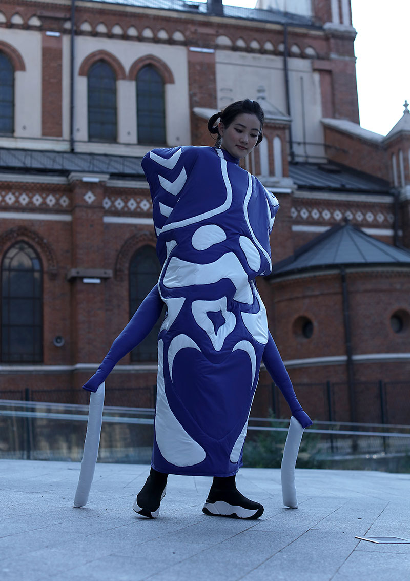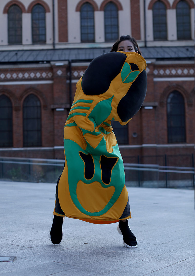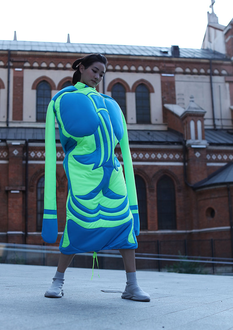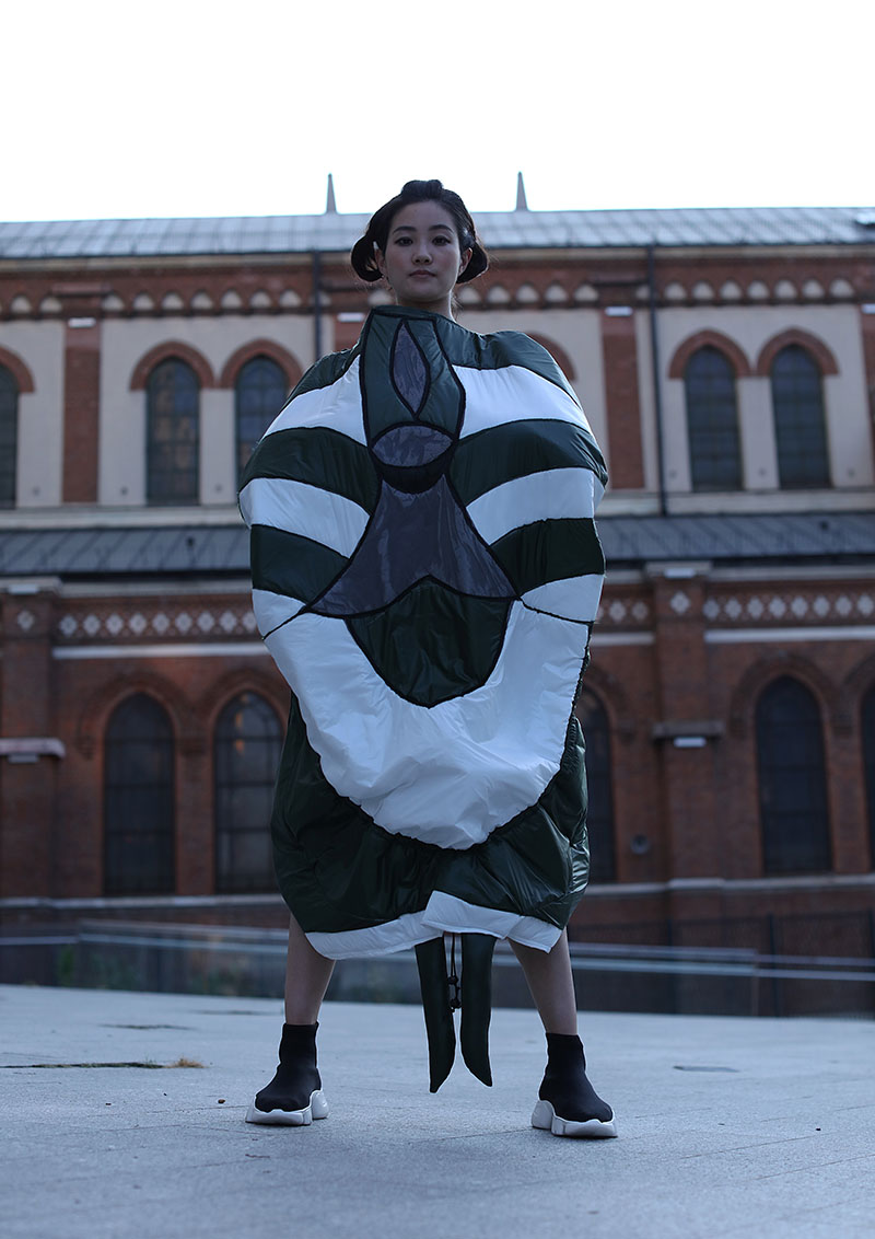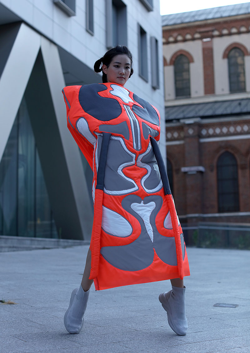 Los insectos de la colección Fusion de Carmen Emanuela Popa AW22 se han construido a partir de materiales impermeables, tejidos elásticos, fluorescentes de alta tecnología, redes y accesorios específicos del sportswear con la intención de crear una interpretación de formas y volumen de la anatomía zoomorfa.