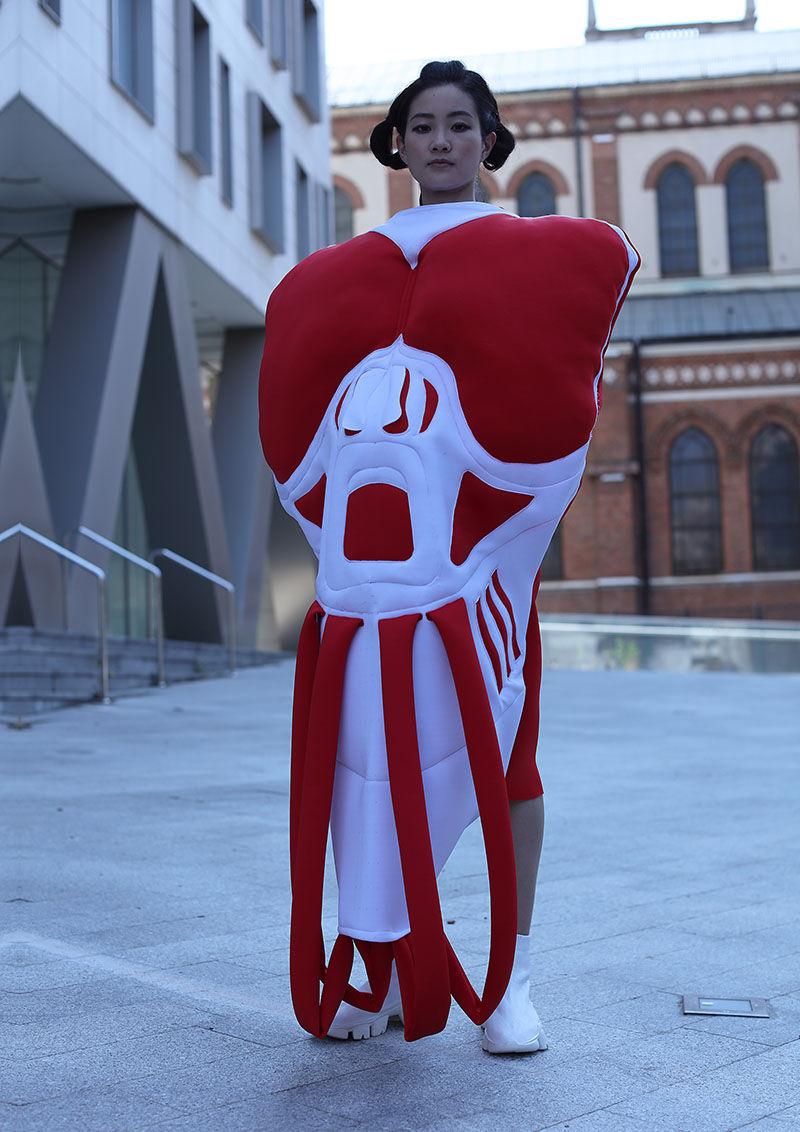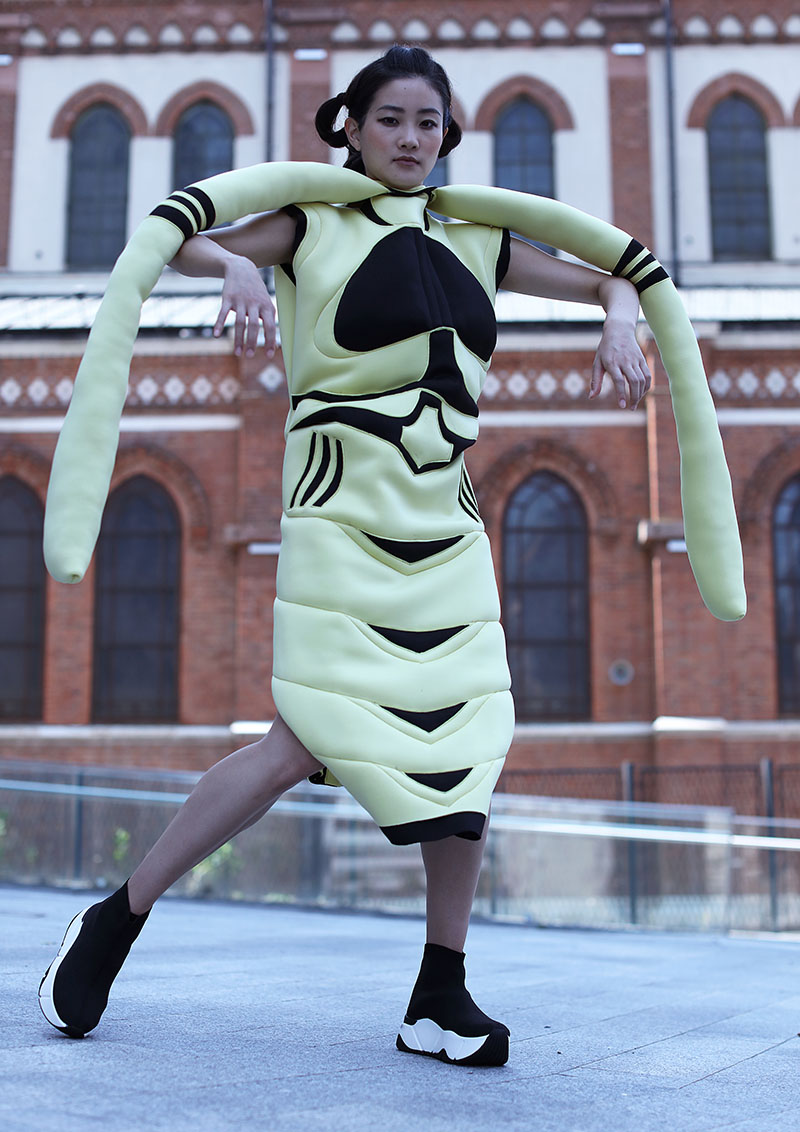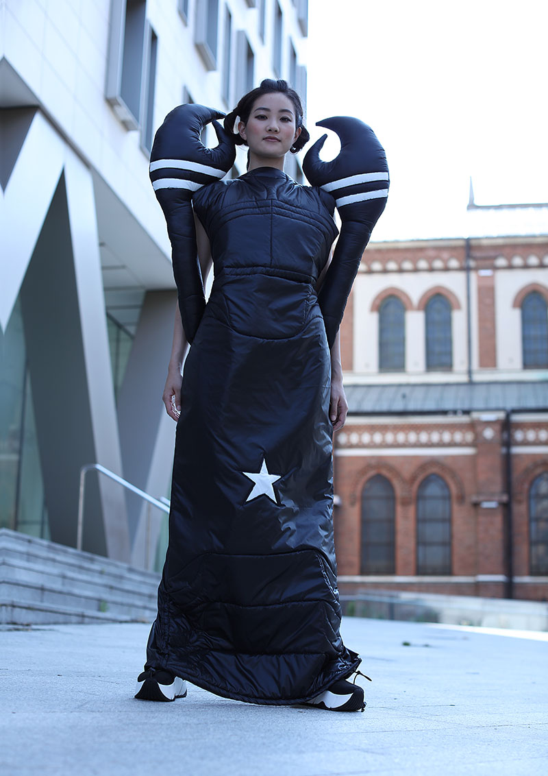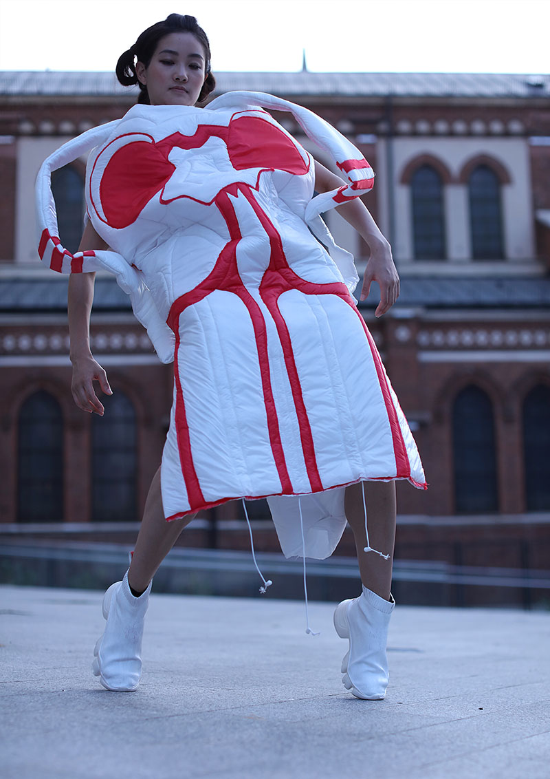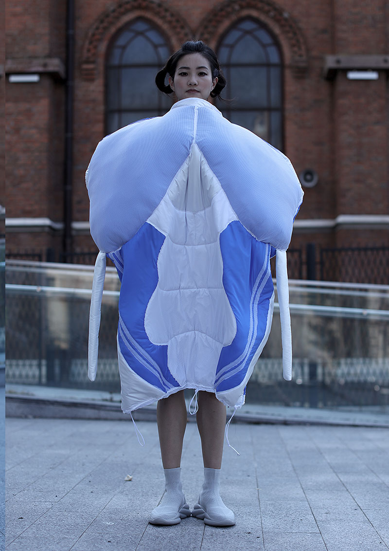 Los insectos de la colección Fusion de Carmen Emanuela Popa AW22 se han construido a partir de materiales impermeables, tejidos elásticos, fluorescentes de alta tecnología, redes y accesorios específicos del sportswear con la intención de crear una interpretación de formas y volumen de la anatomía zoomorfa.