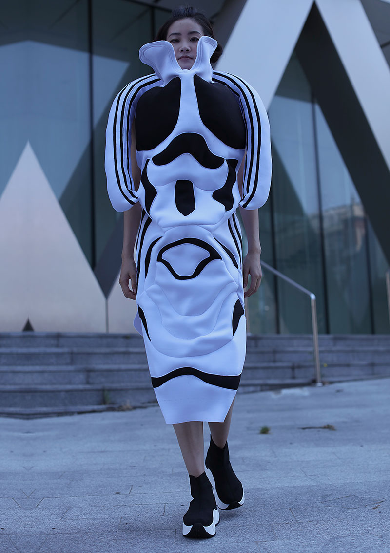 A parte de que las siluetas de los nuevos diseños no concuerdan con las siluetas del cuerpo humano debido a los volúmenes que crea a partir de sus tejidos, la diseñadora lleva las formas al siguiente nivel incluyendo una serie de “estampados” y detalles en cada diseño para conseguir un mayor dinamismo.
