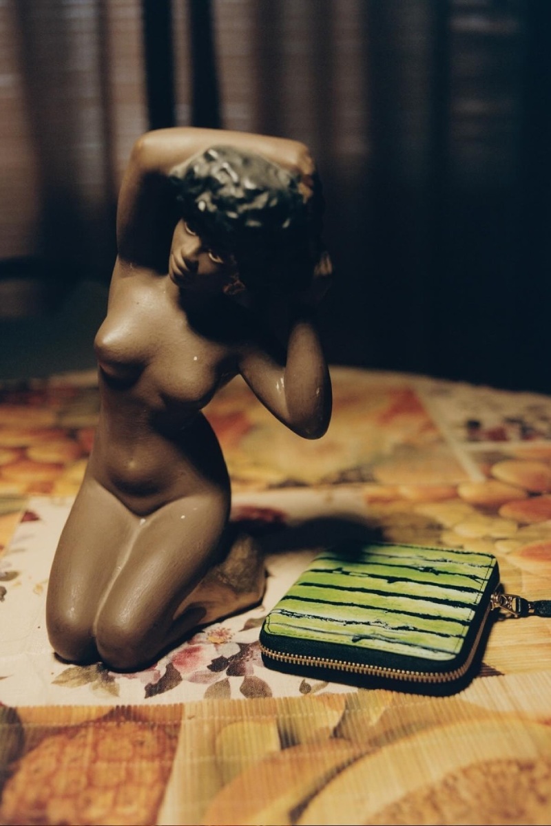 La colección también nos muestra este modelo con un estampado verde estrellado con negro, Que, por si no lo sabíais, es el cuadrante de la bandera afroamericana. Este print también se ve decorando el modelo horizontal Zip Around. La colección cierra con otro print, que emula la piel de una sandía y se puede ver en la billetera más pequeña.