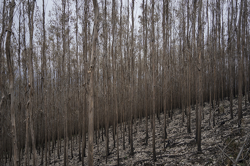 Cartografía do esquecemento (Cartografía del olvido) plantea una reflexión sobre las consecuencias culturales que supone la pérdida del bosque autóctono gallego. La destrucción del bosque atlántico está motivada por diferentes factores políticos, sociales, económicos y medioambientales que provocan consecuencias devastadoras tanto para la biodiversidad como para la memoria e identidad colectiva de una gran parte de Galicia.El conjunto se expone como cómplices y víctimas de un proceso cíclico en forma de atlas o cartografía. Los bosques autóctonos, además de actuar como barrera natural ante un incendio, se caracterizan por ser un elemento simbólico de la cultura gallega: para los celtas, los robles y castaños eran árboles sagrados y una vía de comunicación con el más allá. La plantación, reproducción y normalización exponencial del eucalipto, una especie invasora originaria de Australia que se utiliza para fabricar celulosa y biomasa, causa una profanación del bosque sagrado, no solo por su mera presencia, sino porque se beneficia del fuego en caso de incendio al tratarse de una especie pirófita.