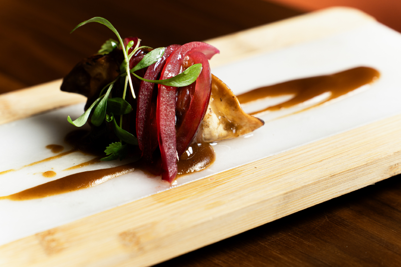Imágenes superiores: 1) Cordero lechal a baja temperatura con demi-glacé. 2) Uno de los aperitivos de temporada del restaurante.
