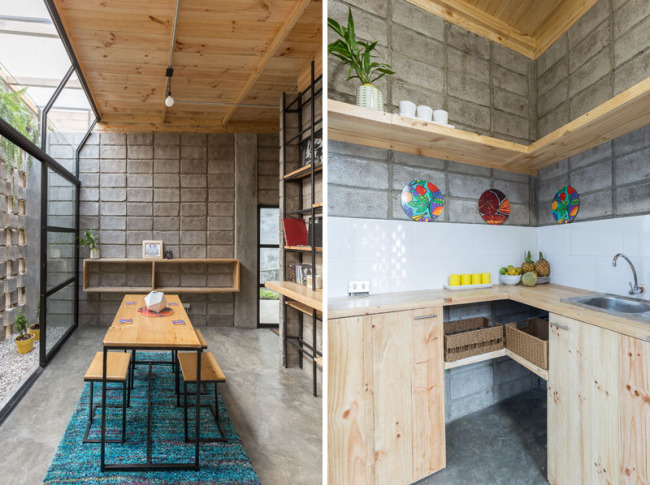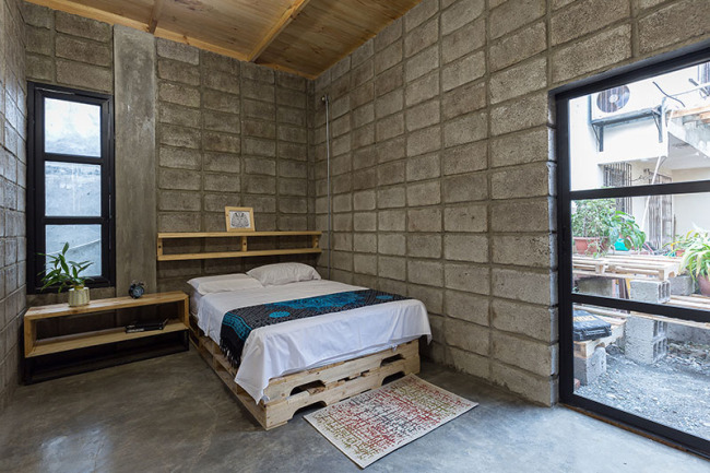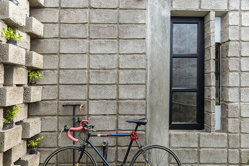 Para su revestimiento se eligieron tipologías tradicionales. La vivienda está construida a partir de la composición de bloques de hormigón intercalados. Las carpinterías de las puertas y ventanas son de vidrio y metal que es el estilo clásico de ecuador. Para favorecer la luz Natura Futura Arquitectura optó además por grandes ventanales con los que lograr también ventilación cruzada.