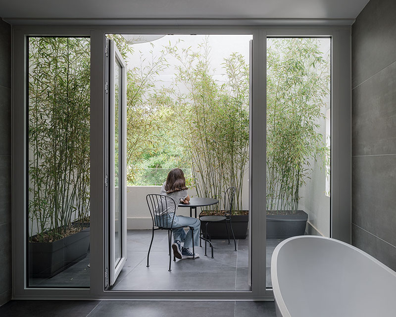 En las plantas superiores de Casa Galgo se sitúa el programa funcional que corresponde a la zona de noche de la vivienda. En la planta primera se ha dispuesto el dormitorio principal que cuenta con un gran baño abierto a una terraza, abierta a la fachada principal. Esta zona verde, de doble altura, está protegida de la calle gracias a la doble piel que ejerce de envolvente exterior.