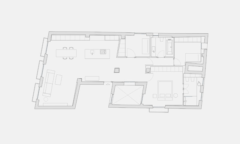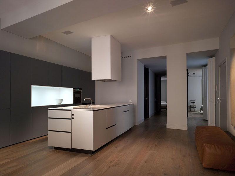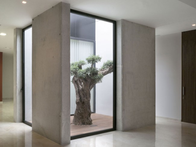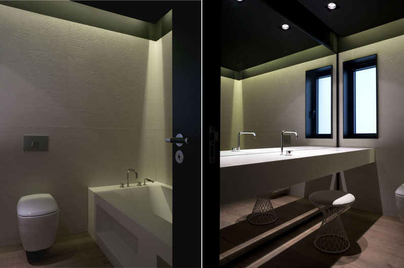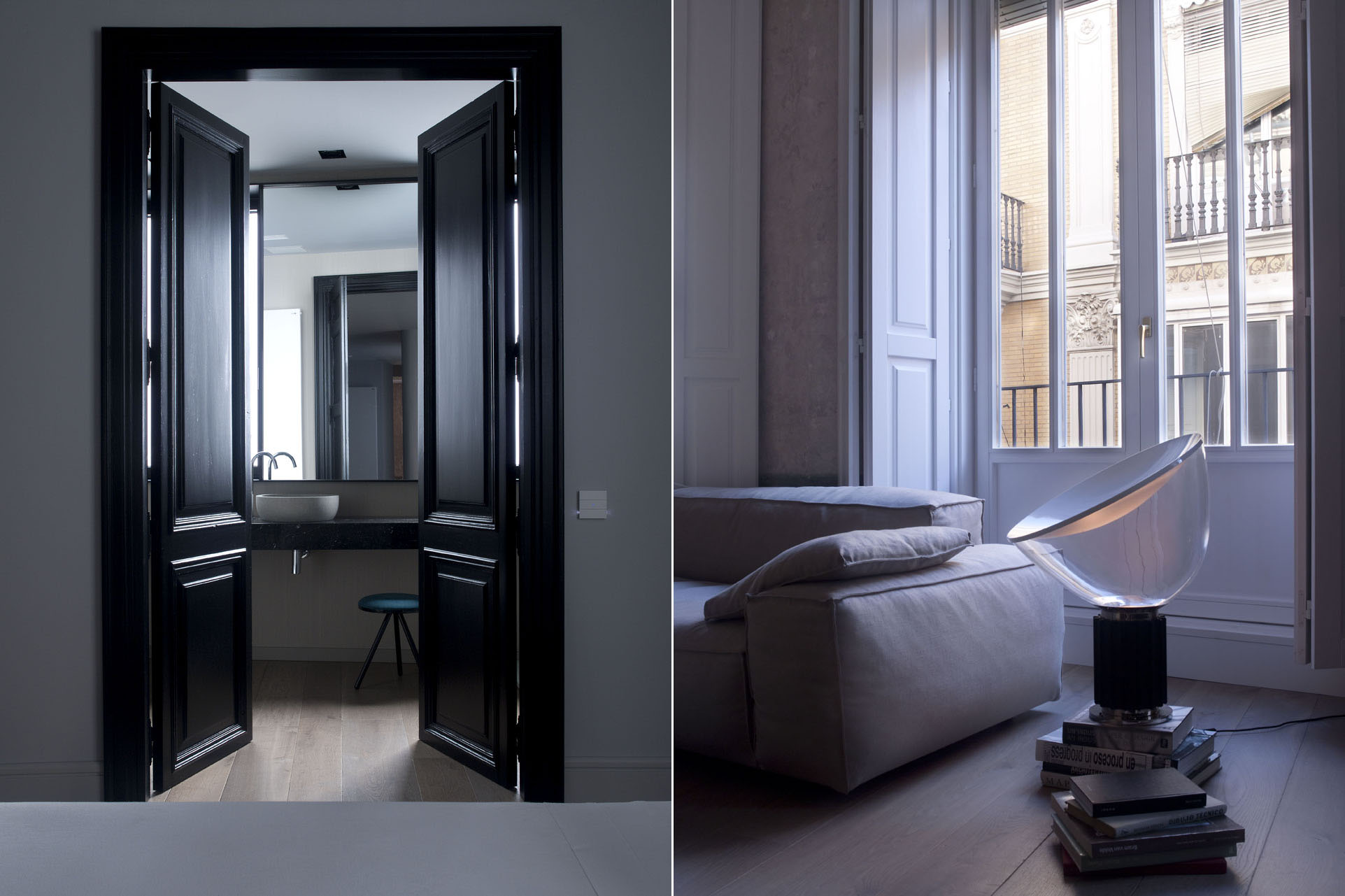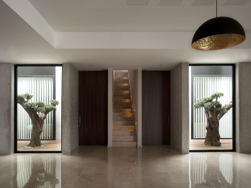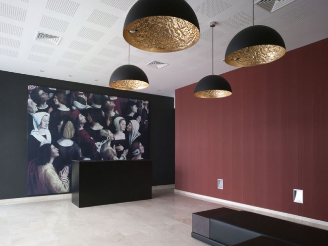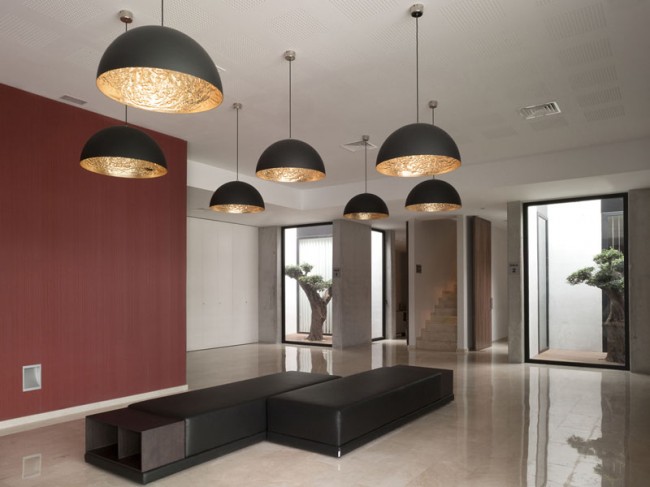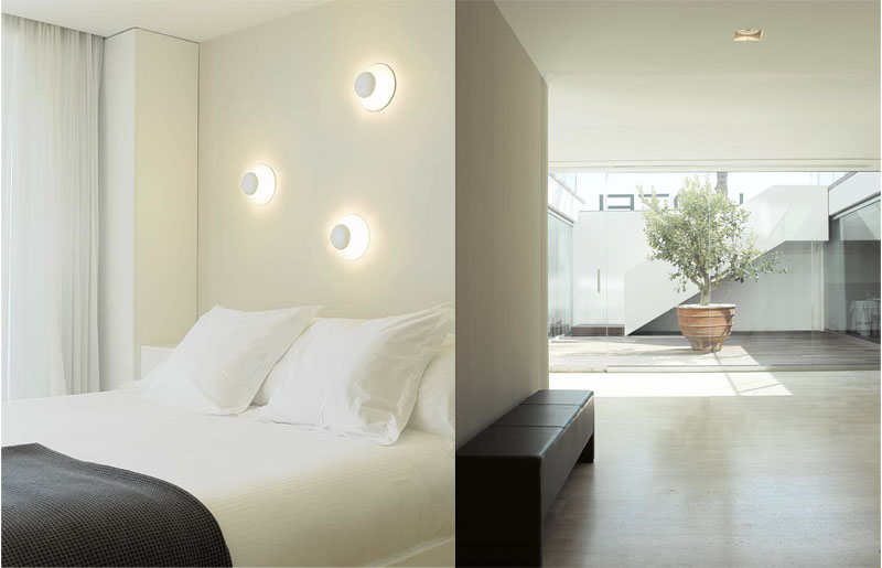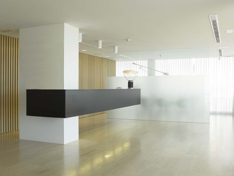 El Hall central, nos conduce a las diferentes estancias del edificio, abriendo en la estructura de hormigón, dos patios centrales que ofrecen luz natural tanto al hall, como a las otras estancias del edificio. Las lámparas del hall son el modelo Stchu-Moon de Catellani&smith.