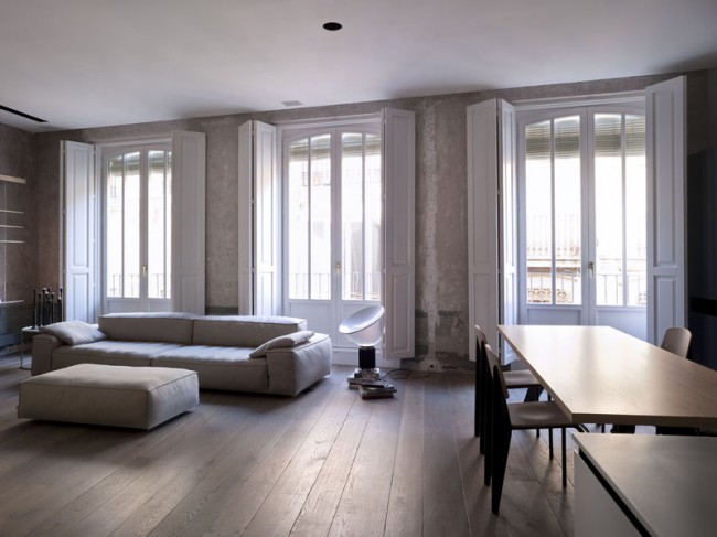 Arriba: Sofás y pouf de Living Divani, Mesas y sillas diseñadas por Jean Prouve producidas por Vitra. Lámpara Taccia diseñada por Achille Castiglioni y producida por Flos