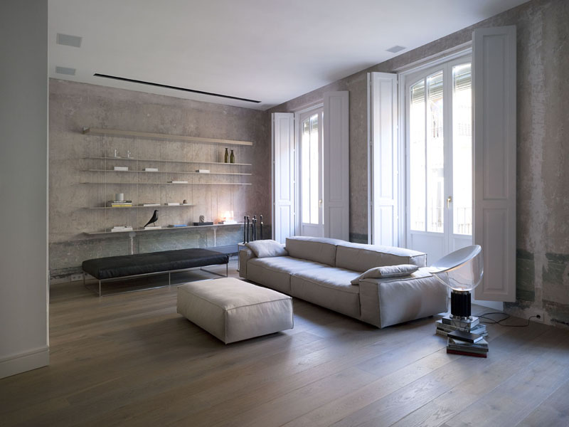 Arriba: Sofás y pouf de Living Divani, Lámpara Taccia diseñada por Achille Castiglioni y producida por Flos