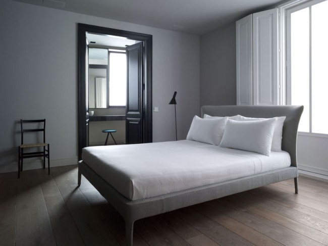 Arriba: Cama de B&B y silla diseñada por Gio Ponti para Cassina. Suelo de roble natural.