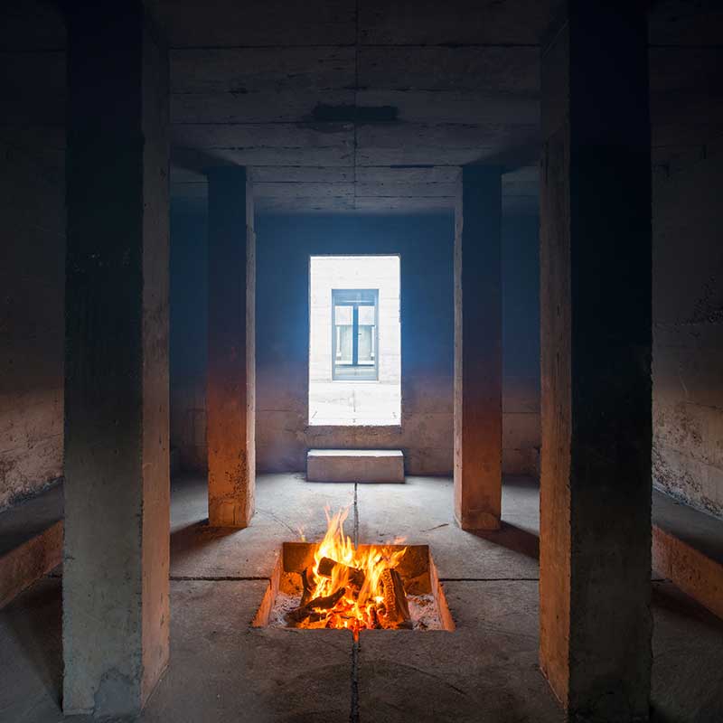 En el interior hay una tenue línea de división funcional. Los espacios son versátiles: hay algunos para residir, otros para trabajar y otros son espacios libres para poder desarrollar la creatividad -además de la arquitectura sus aficiones son amantes de la pintura y la botánica-. “Para nosotros es más interesante pensar una forma de vida, sin distinción entre contenedor y contenido, y sus posibles extensiones significativas o simbólicas. A veces las funciones siguen las formas, otras lo opuesto”, aclaran los arquitectos. Los interiores tienen diversos tratamientos desde el blanco puro hasta el negro marfil, pero también matices de grises verdosos, azulados, violetas o marrones. “Cada habitación tiene un carácter único pero siempre en consonancia con su entorno, tanto el natural como el construido, por ejemplo, una habitación que es sólo para un fogón central. Sus muros están ahumados con un hollín aterciopelado muy delicado, un tono inseparable de su perfume”, nos explica Sofía. Otros espacios están pintados en tonos oscuros para dar calidez, o totalmente blancos para aportar creatividad y luz. Algunos se dejan puros, para resaltar la belleza del conjunto.