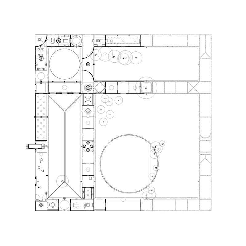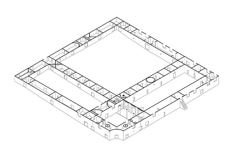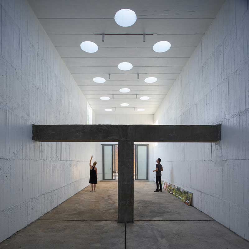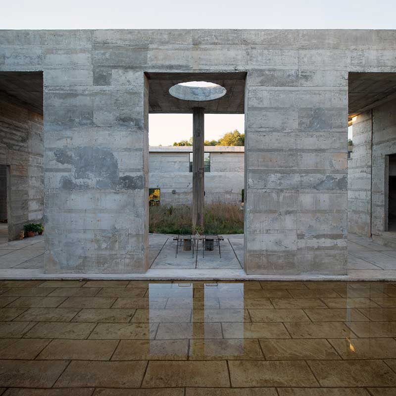 Casa Luna toma las dimensiones de un monasterio y la forma de un claustro. La construcción está formada por 12 bloques con distintas formas: unos rectangulares, otros en forma de “T” y otros en forma de “L”. Los bloques están unidos por juntas sísmicas visibles de 5cm que coinciden con los espacios exteriores o patios, creando así la división física casi imperceptible que buscaban los arquitectos. El edificio es su propia residencia, pero también un espacio abierto sin usos concretos. “Luna es casa en cuanto que es un lugar para vivir, y todo lo demás en tanto a posibilidad. Lo concebimos como un lugar amplio, exageradamente amplio, para admitir otras funciones que exceden lo doméstico”, nos cuenta Sofía. “Nuestro trabajo tiene una naturaleza muy amplia. Aunque hemos sido formados como arquitectos, nuestra producción explora otros caminos desde la poesía a la filosofía, la pintura y la escultura o el diseño de muebles y jardines. Por ello entendimos este lugar como una marco de acción, un campo de juego”, nos explican desde Pezo Von Ellrichshausen.