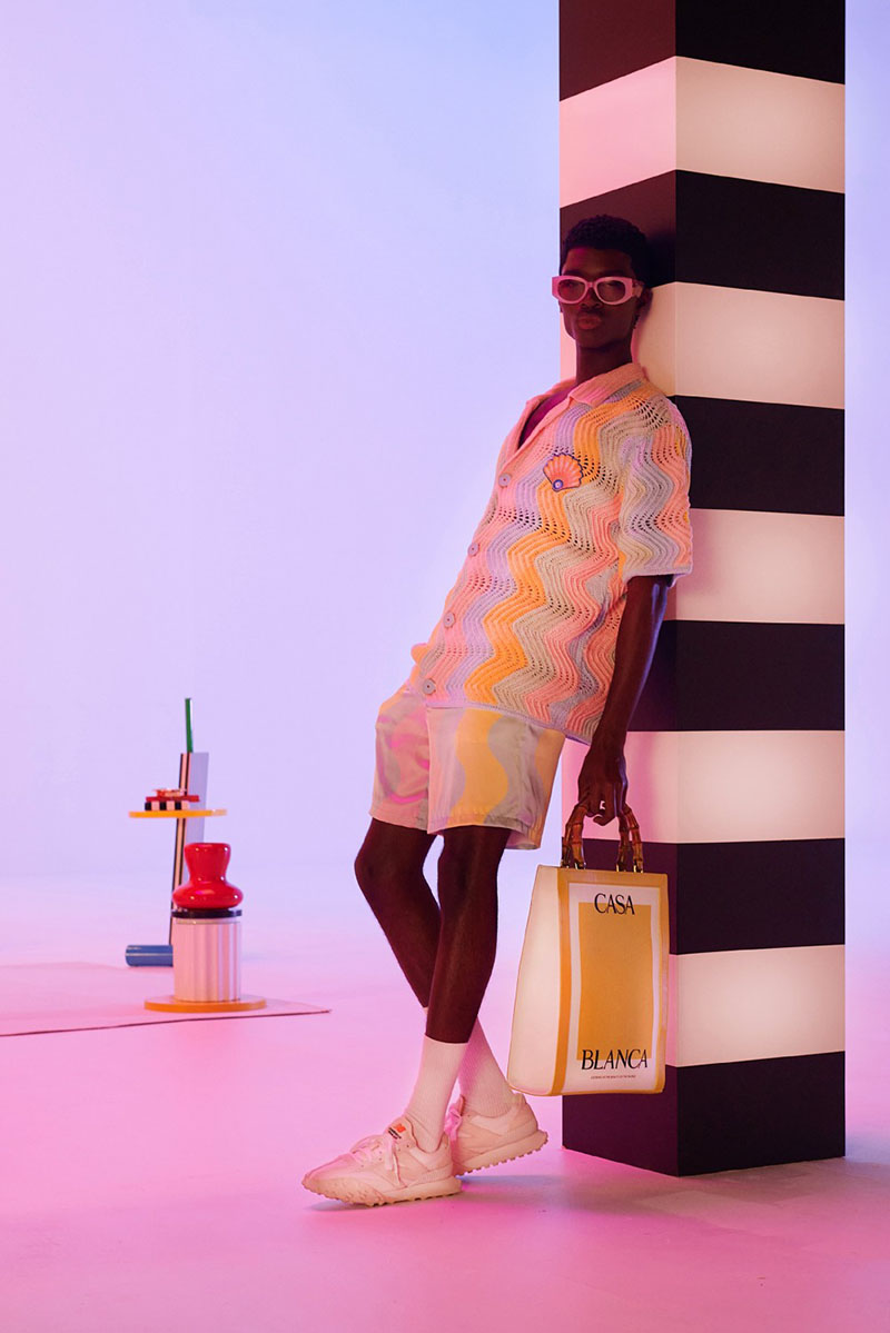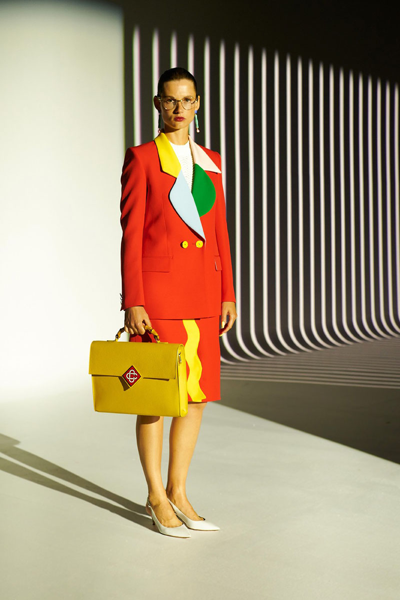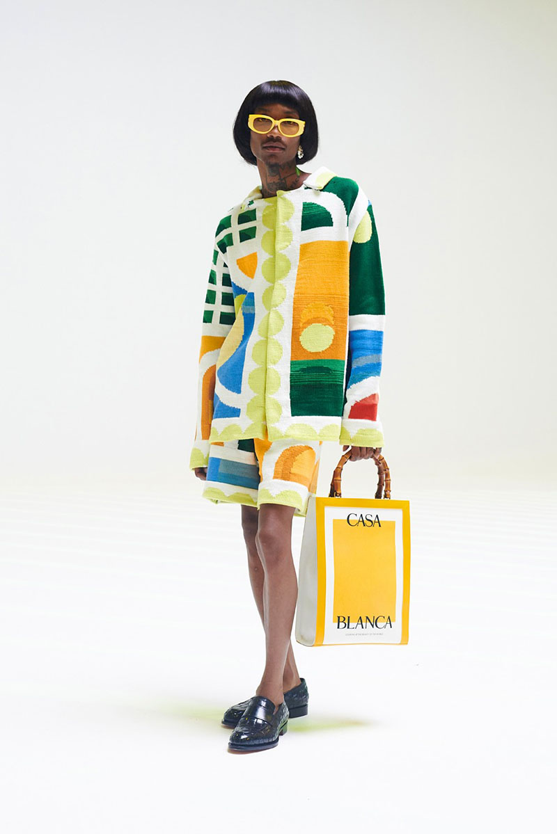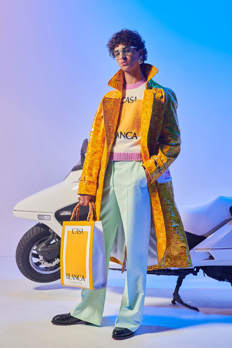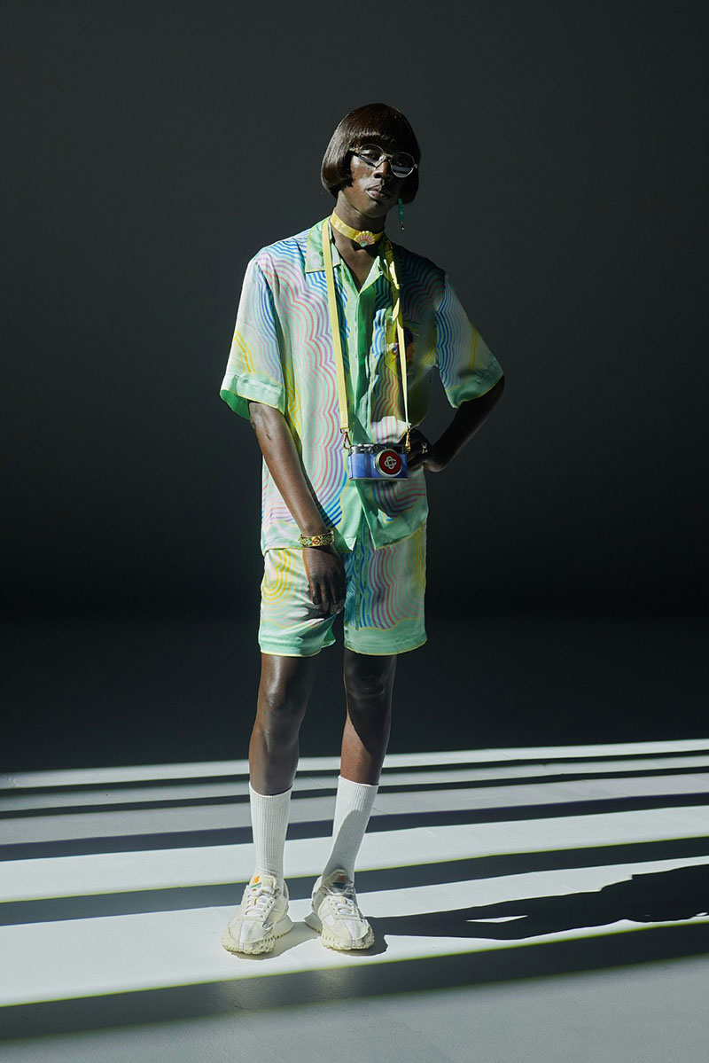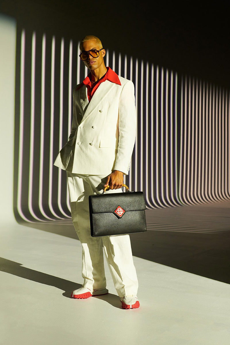 Otro de los puntos fuertes de Casablanca vuelve a brillar por sí solo; nos referimos a los accesorios, que aunque presenten unos looks en los que parezca que no es necesario añadir ni un detalle más, se siguen agarrando a la filosofía del más es más con la que consiguen dar un toque extra de locura a esta colección solo apta para los más atrevidos. Estamos hablando de pendientes, gafas de sol, anillos, pañuelos, e incluso bolsos inspirados en las clásicas tarteras Bento Box japonesas.