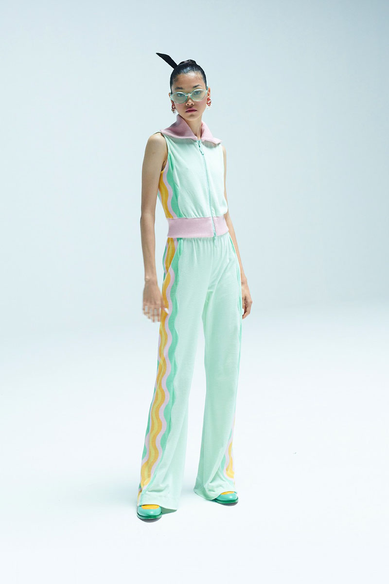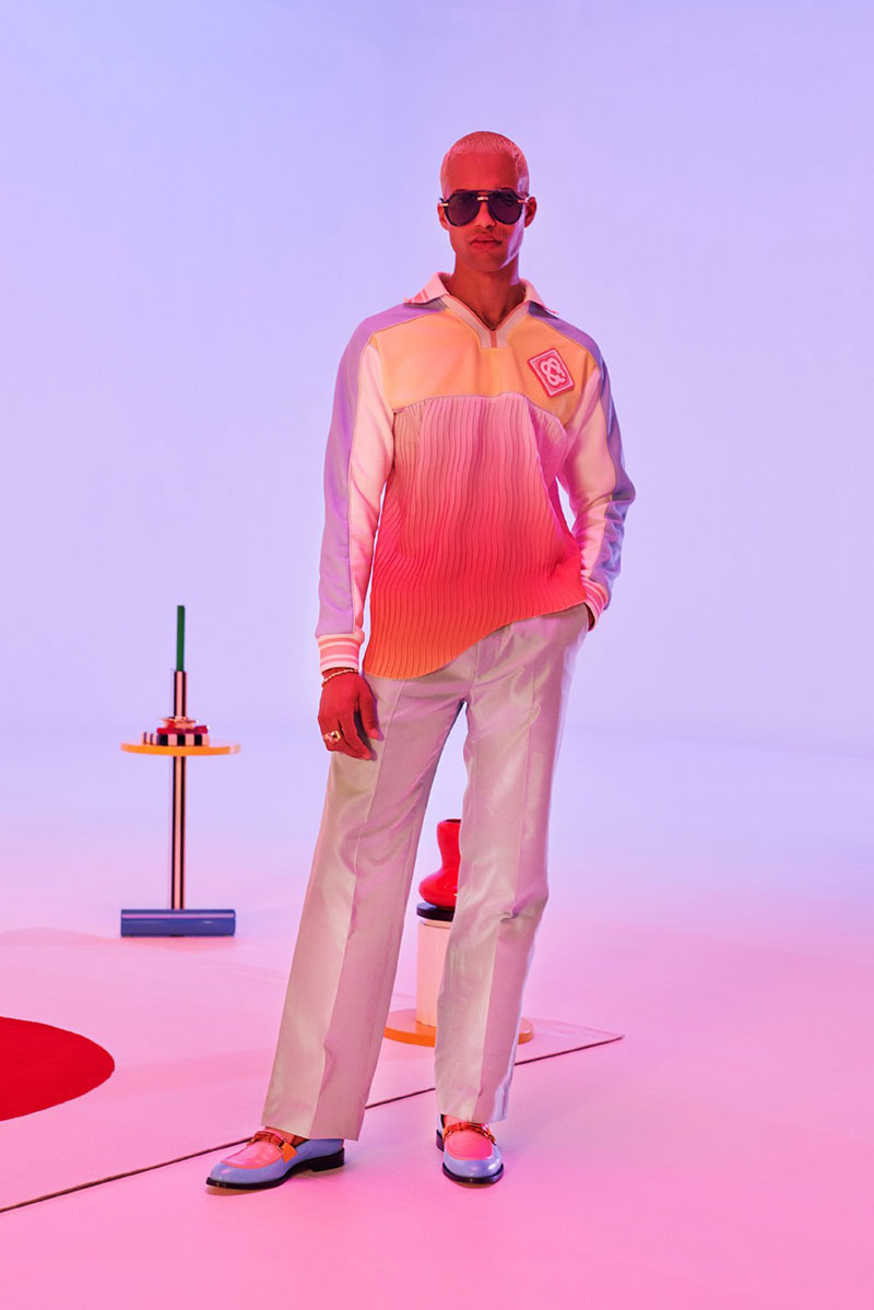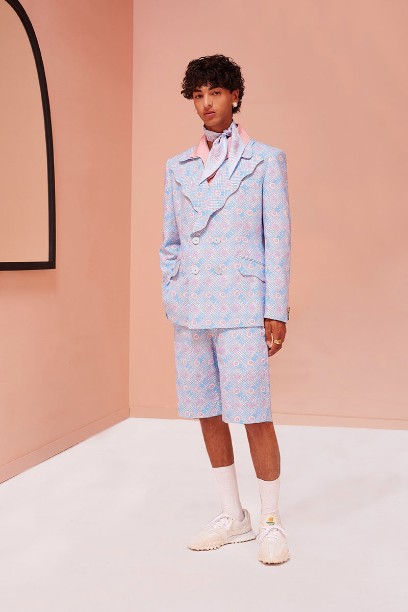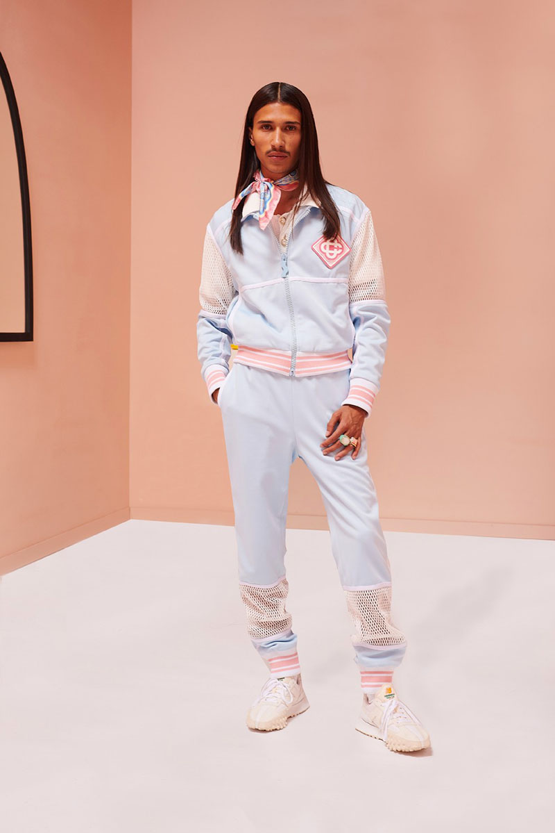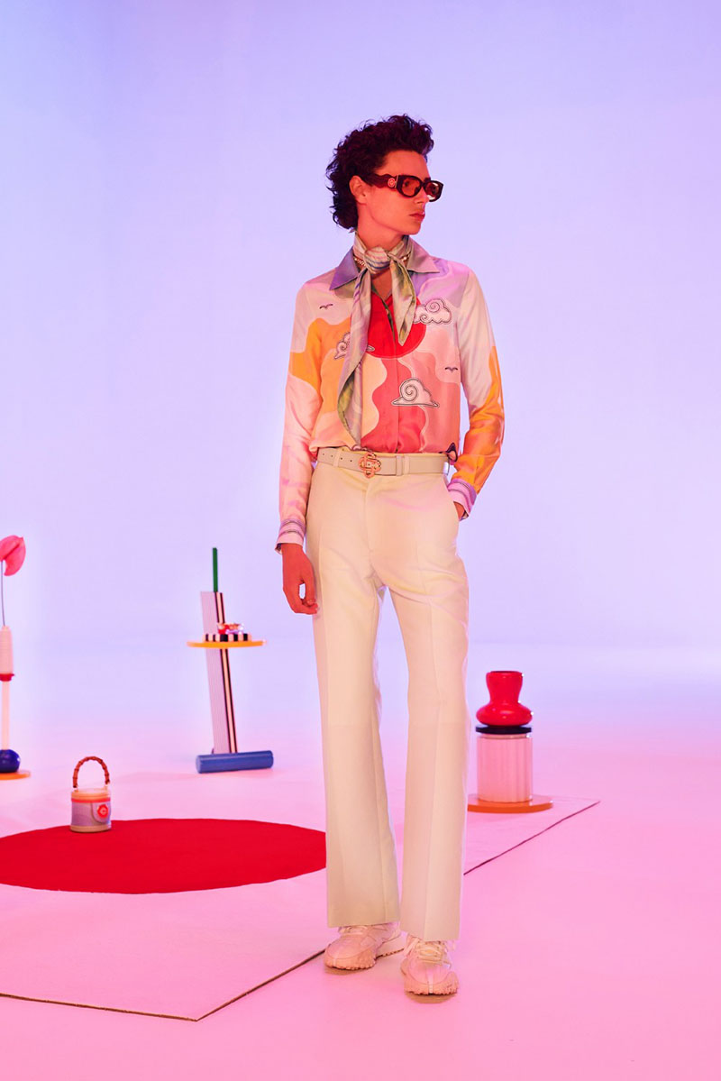 Los clásicos chándales llenos de contrastes de color pastel y complejas composiciones regresan esta vez con unas siluetas mucho más refinadas. Estos se combinan con otras prendas más formales como las camisas con cuello americano alto que se cierran con corbatas llenas de los estampados más llamativos.