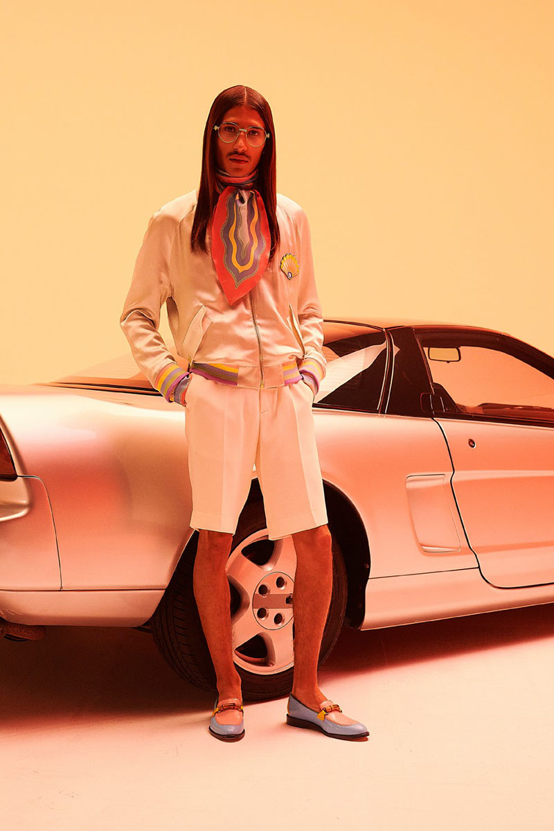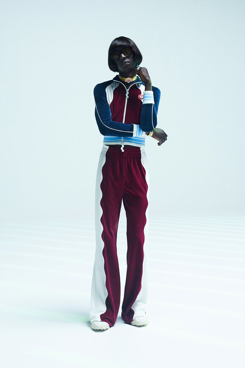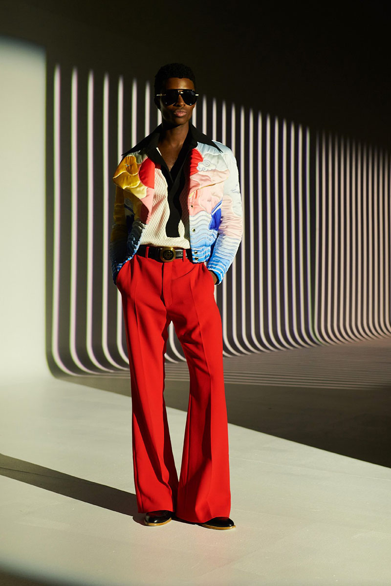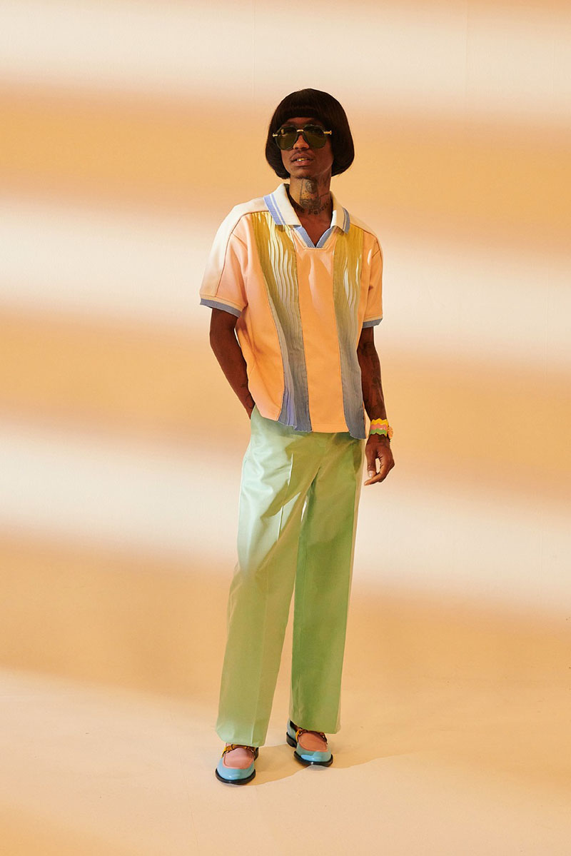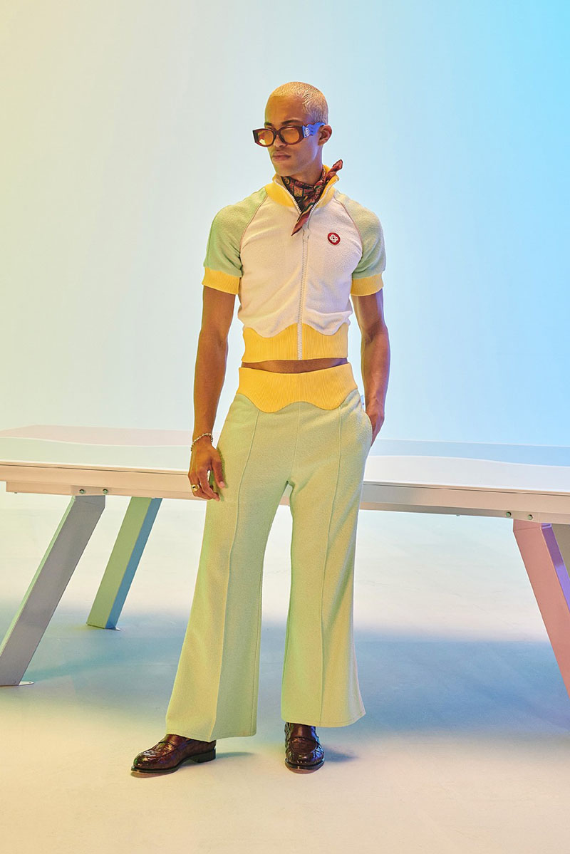 Los clásicos chándales llenos de contrastes de color pastel y complejas composiciones regresan esta vez con unas siluetas mucho más refinadas. Estos se combinan con otras prendas más formales como las camisas con cuello americano alto que se cierran con corbatas llenas de los estampados más llamativos.
