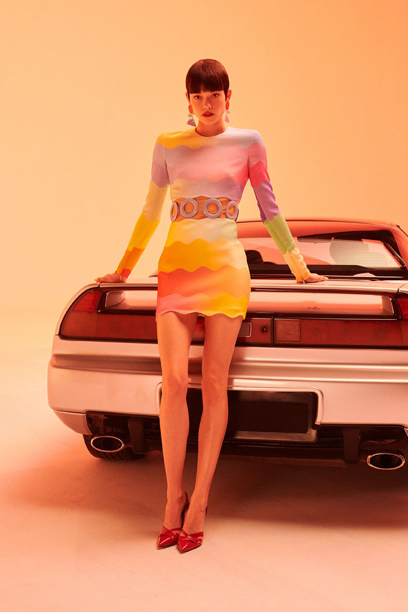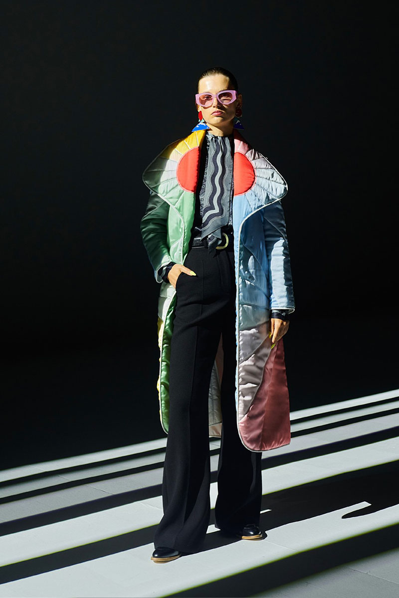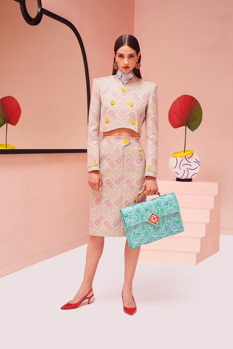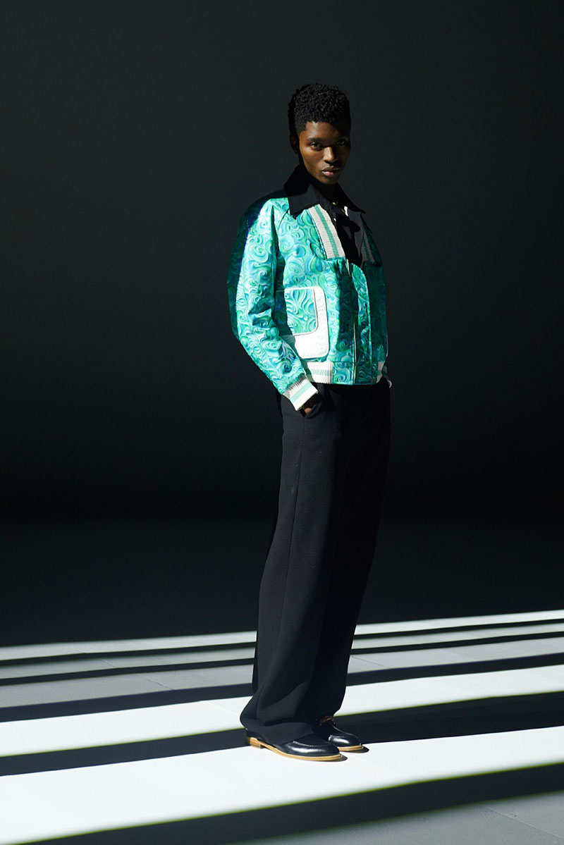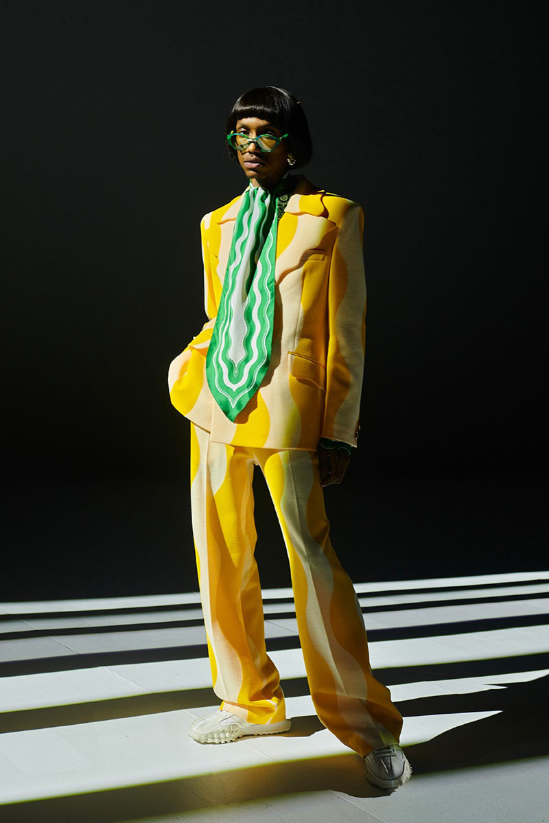 Los clásicos chándales llenos de contrastes de color pastel y complejas composiciones regresan esta vez con unas siluetas mucho más refinadas. Estos se combinan con otras prendas más formales como las camisas con cuello americano alto que se cierran con corbatas llenas de los estampados más llamativos.