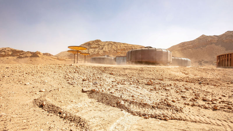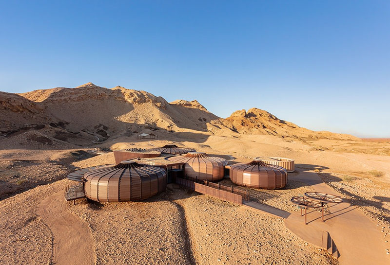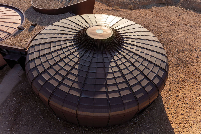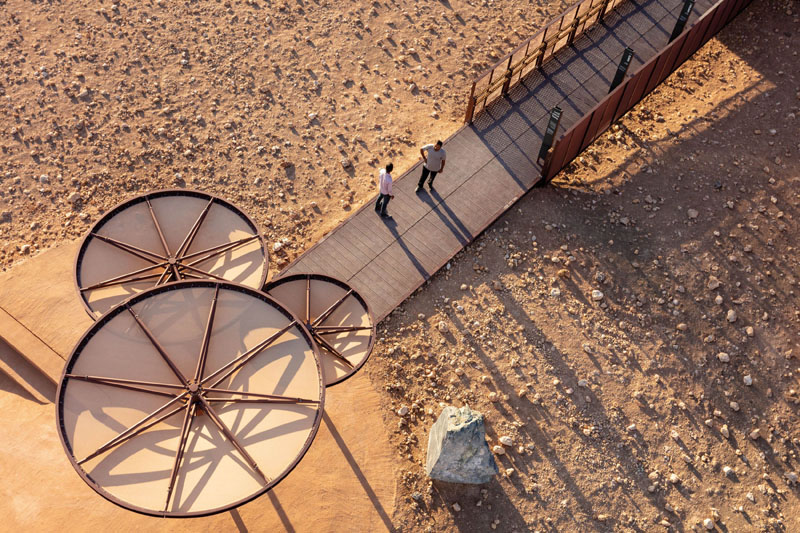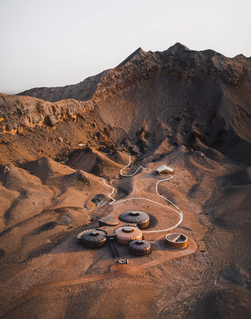 Este conjunto de construcciones, es uno de los trabajos finalizados este año 2020, por el estudio Hopkins Architects. Lo que podría parecer una base lunar, es en realidad un parque geológico ubicado en los Emiratos Árabes. Una intervención que busca la integración con el medioambiente.