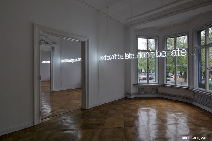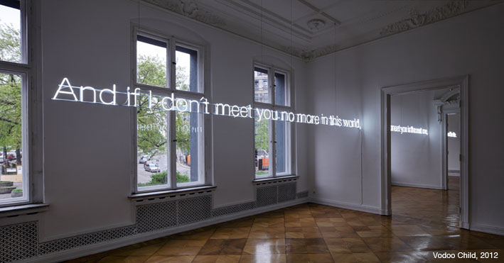 En su segunda muestra en la galería, Cerith Wyn Evans presenta un neón de 14 metros de largo, este trabajo se extiende a través de las 3 salas principales. El texto es una cita de la canción “Voodoo Child” de Jimi Hendrix, para leer dicha cita los espectadores tienen que caminar a lo largo del neón, por lo que el acto de lectura se experimenta como un proceso espacio-temporal.