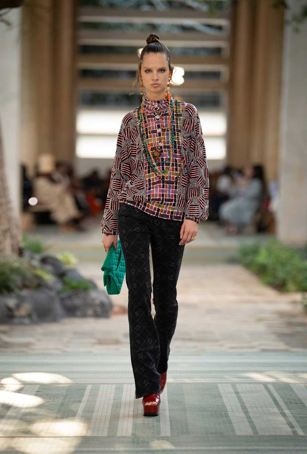 Virginie Viard, al frente de la creatividad de Chanel, ha expresado su amor por Dakar y Senegal a través de colores cálidos, motivos vegetales y líneas geométricas. Para canalizar estos sentimientos ha dibujado siluetas que nos transportan a los años 70: pantalones acampanados y ajustados, abrigos entallados, cuellos sementeros, zapatos con plataformas… Formas retro que conviven con otras más contemporáneas como las sudaderas oversized, el denim con logos y patchwork o los vestidos asimétricos. Prendas con el toque maestro de los artesanos, a los que también rinde homenaje la colección Métiers d’Art. Por ejemplo, bordados florales. Pero, por encima de todo, el rey de la Maison: el tweed, en este caso multicolor, que convive con colgantes brillantes, lentejuelas y modernos encajes. En definitiva, una fusión de los principales movimientos musicales del siglo XX, del pop al punk pasando por el soul, funk y disco.