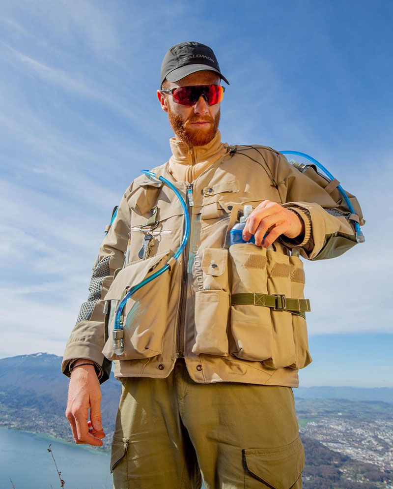 No, la nueva locura del internet no son unas nuevas zapatillas Salomon para nuestros conjuntos gorp-core; aunque la idea no está tan lejos del concepto. Junto a la firma londinense Greater Goods ha desvelado una pieza bastante curiosa que tiene a todo el mundo como loco. Se trata de una chaqueta soft-shell en tonos beige y oliva de Gore-Tex con sobredosis de bolsillos utilitarios y botellas, muchas botellas. La pieza de la nueva colaboración de Salomon X Greater Goods se titula S/LAB HYDRATATION CREW JACKET y tal como su nombre lo indica, es una prenda pensada con la hidratación (o hiperhidratación) en mente.