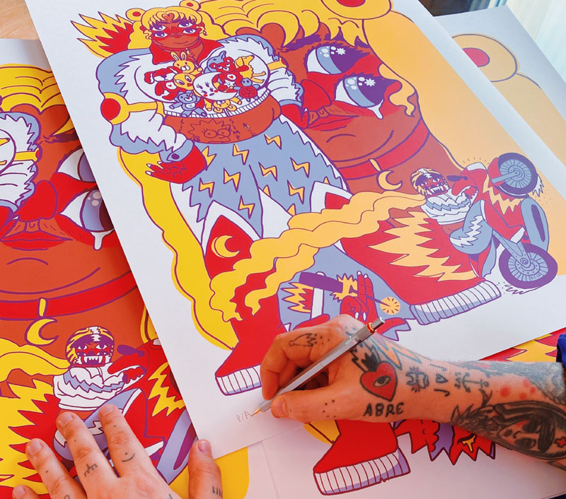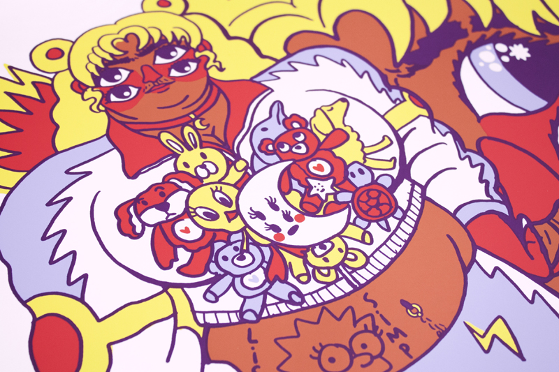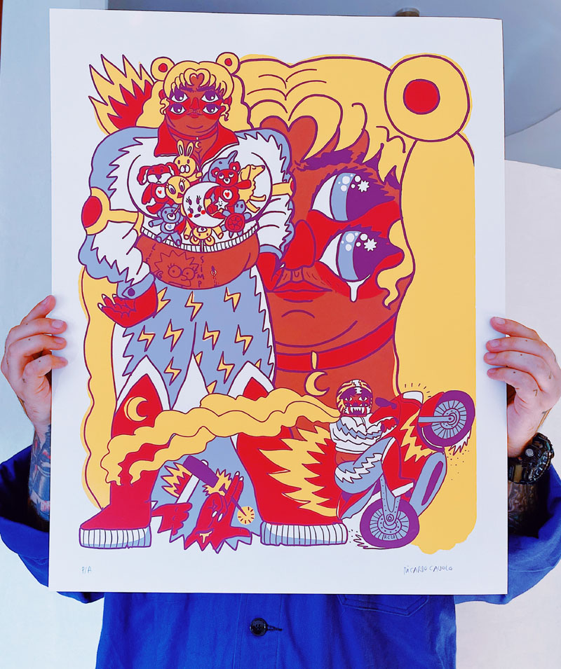 Sailor Moon, la serie de manga escrita e ilustrada por Naoko Takeuchi en 1992 y adaptada después a una serie de anime, tiene una legión de seguidores en todo el mundo. Ricardo Cavolo es uno de ellos. En esta serigrafía de edición limitada llamada Chonga Moon, el artista usa su figura “para alterarla y presentar a una mujer menos estereotipada y con mayor diversidad. Es una especie de juego punk para romper todo ese millón de estereotipos de los que se han abusado tanto en la cultura del entretenimiento. Con el peligro que eso tiene especialmente con formatos para niñas y niños”.