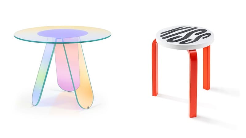 Izq: Patricia Urquiola, “Shimmer”, 2019. Der: Barbara Kruger, “Untitled (Kiss)”, Tamboret 60, 2019 (Design Alvar Aalto). Ambas © Vitra Design Museum, foto: Andreas Sütterlin, © VG Bild-Kunst, Bonn 2021, 2019