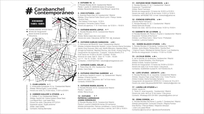 Carabanchel es un distrito mestizo lleno de artistas nacionales y de todas partes del mundo, por eso van a abrir sus puertas 18 espacios (6 galerías, 4 project spaces y 8 grandes estudios) con más de 50 artistas que muestran sus obras: @club_lamata, @cornergalleryandstudio, @estudio10_madrid, @ego_____estudio,