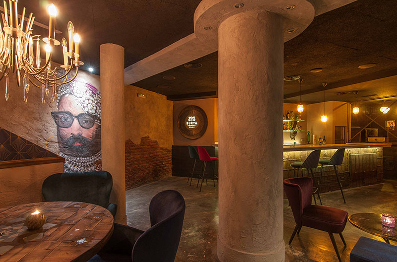 Nada más aterrizar en el sótano, un enorme maharajá hipsterizado nos recibe desde la pared. Este mural a todo color del artista Fabio Camarotta poco a poco nos irá recordando a un inquietante Ignatius Farray con pendientes de aro. Serán los efluvios de la ginebra o la oscuridad furtiva, puesto que a la primera nos vemos ya acomodados al ambiente de club sofisticado que contrasta con la puesta en escena de arriba, más eso, más callejera. Terciopelos, mesas de ebanista y una barra de mármol con la base hecha de baúles traídos de la India, más una reja tras la que el dj (los fines de semana hay sesiones de house tribal, hip-hop y tech-house) se parapeta y un grafiti de tonos flúor a la entrada de los lavabos, dan forma a este Easy Bolo en el que la interiorista canadiense Alicia Bowers se ha lucido con creces.