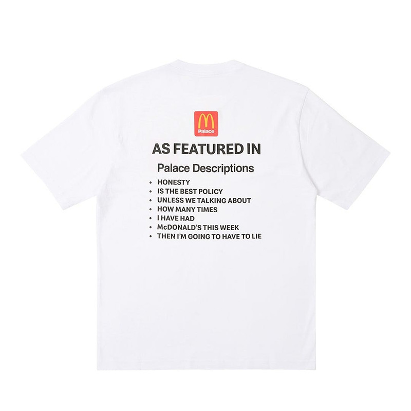 Este primer adelanto de la colabo Palace X McDonald’s constó de un visual de fondo blanco, con descripciones de producto similares a las que encontramos en su web. Y nada más, pero ¿de verdad era necesario esmerarse tanto? La verdad es que no, y este es un terreno que Palace domina a la perfección: ironía y cutrez adrede.