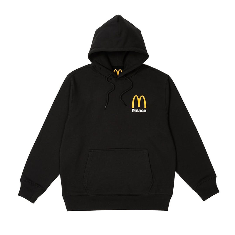 Terminando lo que hemos visto hasta ahora. Una sudadera de corte oversized en negro cierra las prendas de ropa. Un logo colaborativo a pequeña escala decora el pecho y uno más grande el dorsal. Como es habitual en colabos de moda urbana de la cadena de comida rápida, su logo de arcos dorados corona el interior de todas las prendas.