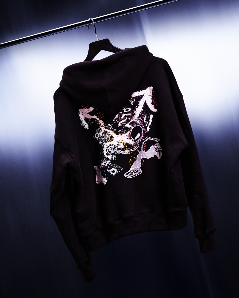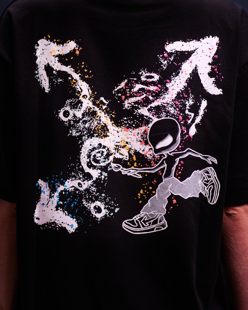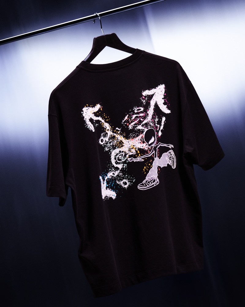 En el dorsal es donde está lo más interesante. Ambas prendas de Off-White X Unvrs vienen con un print exclusivo que toma la mítica cruz (inspirada en el logo del aeropuerto de Glasgow) y la distorsiona como si fuese un motif pintado a mano. También se añaden salpicaduras de pintura y al artista de la obra: un marciano con pantalones baggy y sneakers chunky.