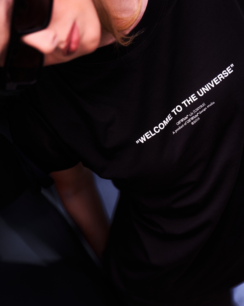 Lo que sí vale la pena analizar son los gráficos que decoran las prendas de Off-White X Unvrs. En el frontal, ambas piezas destacan un print que solo se compone de elementos icónicos del ideario de la firma. Como elemento central, destaca la frase Welcome to the Universe en helvética bold entre comillas; lo típico de Off. Y debajo de esto, el típico “texto legal” que subraya todas las creaciones de la firma.