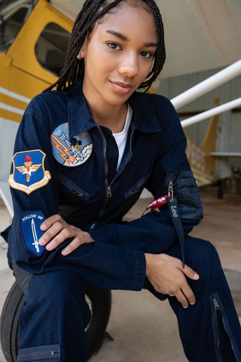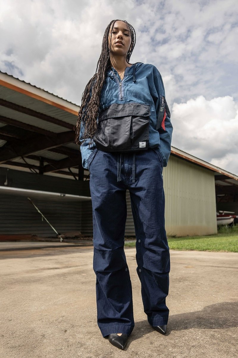 Completando los looks, la colección de Alpha Industries X Lee presenta una reimaginación del mono de vuelo de Lee con bolsillos y paneles de nylon. Y, jugando un poco con la heráldica de los escuadrones de vuelo, se decora con una infinidad de parches. También tenemos un pantalón cargo convertible y unos pantalones para la nieve de algodón ripstop con diseño de rayas. Y, como único básico, tenemos una camiseta oversize teñida en índigo.