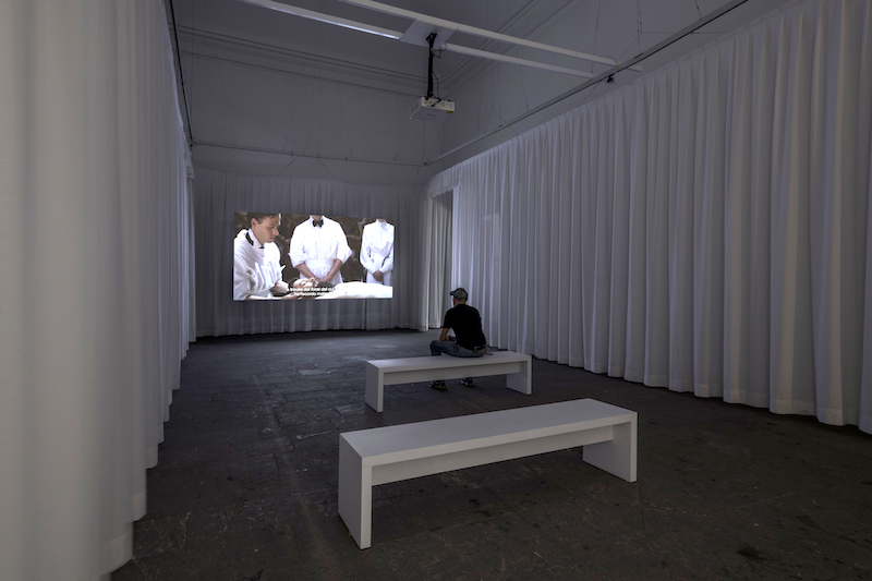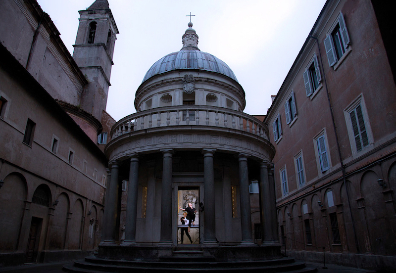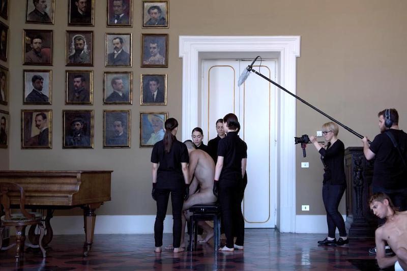 IL LINGUAGGIO DEL CORPO (2015) es una performance fragmentada en tres partes concebida para tres espacios enblemáticos de la Real Academia de España en Roma, entre ellos il Tempietto de Bramante (1510) en San Pietro in Montorio, que instituyó los ideales arquitectónicos del Renacimiento. El artista generó una especie de máquina de performance en la que los ejecutores eran a su vez público de sí mismos y las cámaras sustituían a la audiencia presencial. Para esta performance, tanto intérpretes como equipo de filmación siguieron las instrucciones del artista, también ausente durante la performance, ciñéndose a una directriz en forma de lista inspirada en el No Manifesto (1965) de la bailarina y coreógrafa Yvonne Rainer.