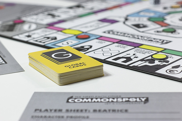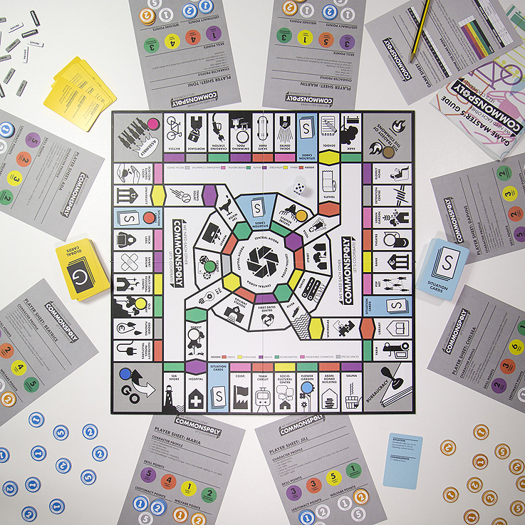 El Commonspoly es un juego de mesa cooperativo que propone cambio de mentalidad: si en los juegos de mesa tradicionales se compite individualmente para alzarse como ganador de la partida, en este juego de mesa los participantes tienen que encontrar formas de dialogar y de cooperar con el objetivo de alcanzar, a través de sus movimientos en el tablero, un mundo mejor.
