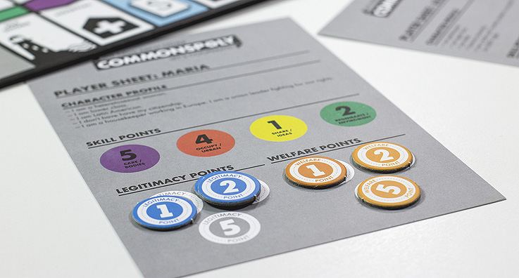 Pero no va a ser tan fácil como parece… En Commonspoly cada participante, al principio de la partida, cogerá aleatoriamente una ficha de personaje. Cada ficha representa un personaje distinto, y dependiendo de su posición en la sociedad, tendrá más o menos facilidad para acometer los cambios necesarios para un mundo mejor. Omar es un hombre heterosexual de clase baja con origen marroquí y sin papeles; Lisa es una mujer negra y lesbiana de clase media con papeles; John es un hombre trans blanco de clase media. Sus privilegios o la ausencia de ellos irán limitando o posibilitando distintos escenarios para cada uno de ellos. Esto ayuda a situar la reflexión sobre la capacidad de cooperación a un segundo nivel: ¿cómo cooperamos a pesar de provenir de culturas distintas, de clases sociales distintas, a pesar de encontrarnos en una situación de vulnerabilidad distinta?