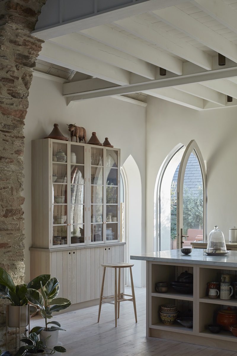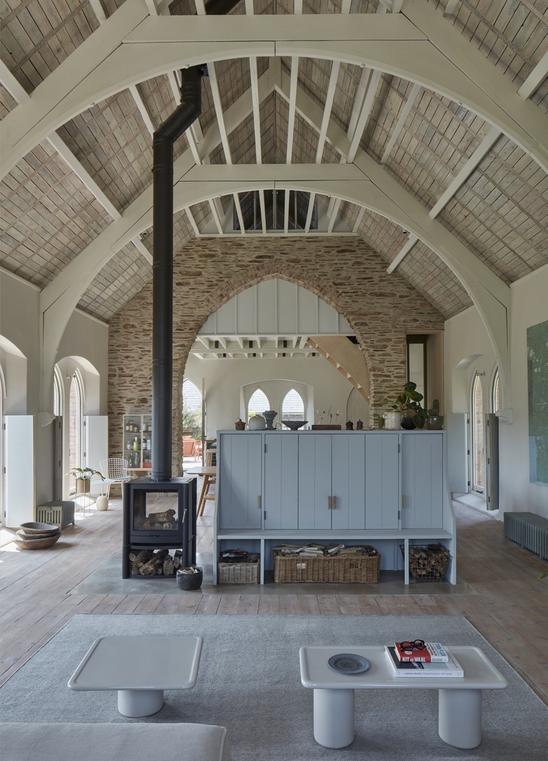 Bajo la dirección de Jonathan Tuckey, el estudio de arquitectura londinense ha puesto en valor la monumentalidad eclesiástica de la antigua capilla con un diseño que reivindica la iluminación natural. Nuevos huecos de forma ojival, igual que los originales, se han abierto en los laterales, inundando de luz el diáfano espacio de la nave, destinado ahora a las estancias comunes de la casa; y se ha logrado eliminar la penumbra de la vieja cripta con una planta baja vinculada al jardín. El equipo también ha mejorado la eficiencia energética del edificio gracias a la incorporación de placas solares y un buen aislamiento térmico, que garantiza el confort en los interiores.